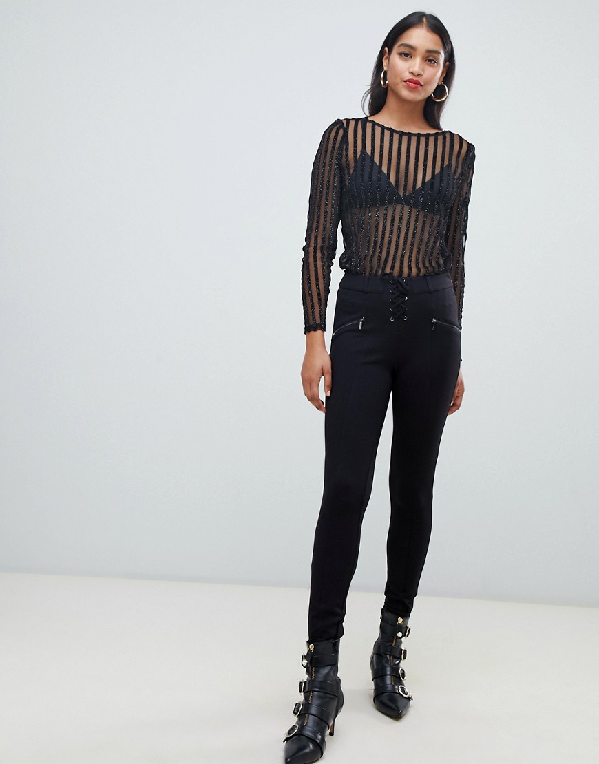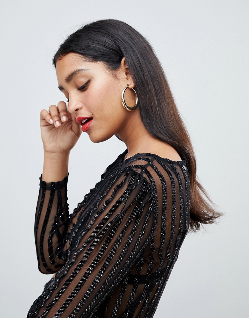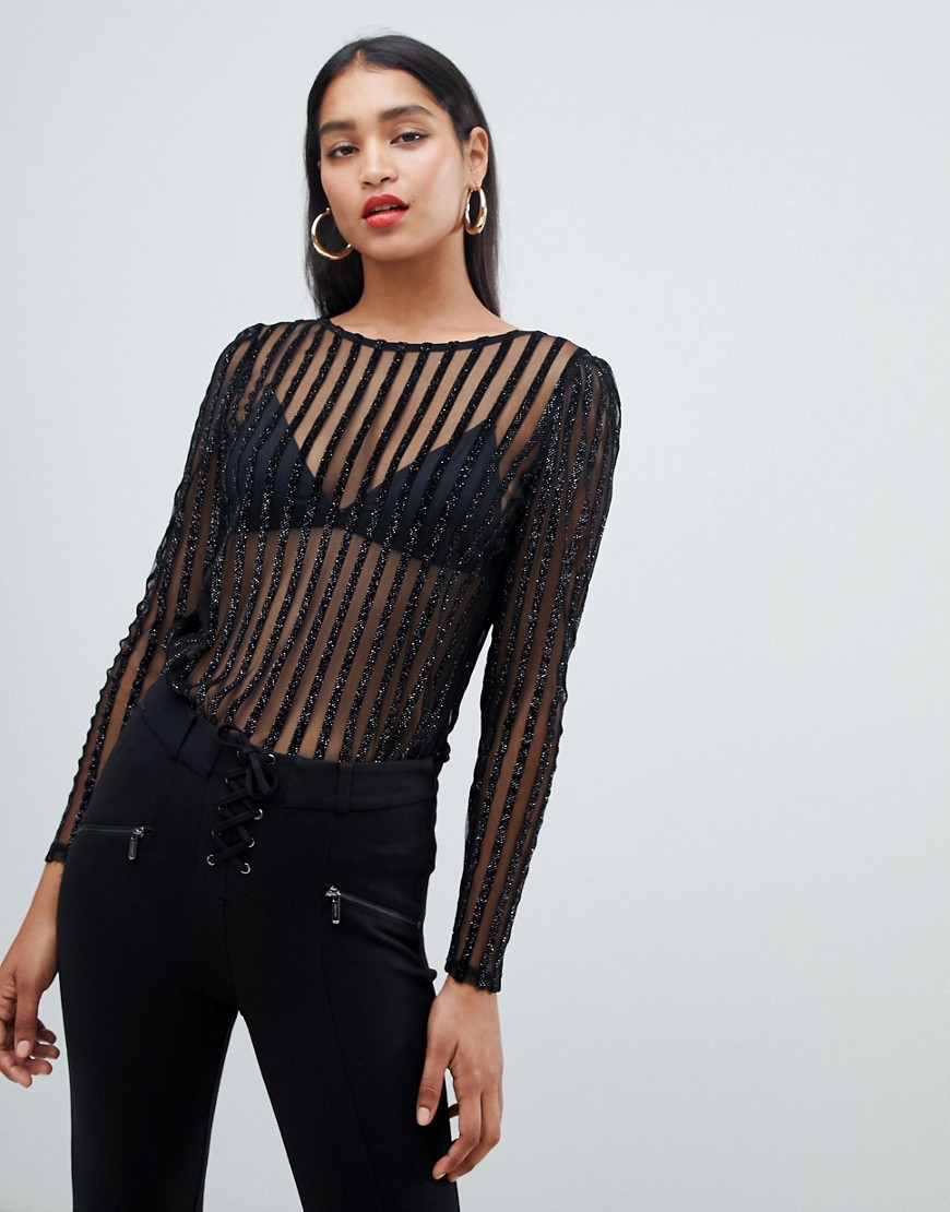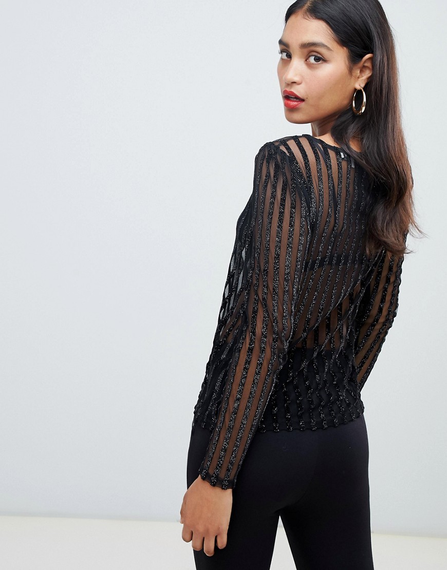 Czarna prześwitująca bluzka w paski ze zdobieniami S
