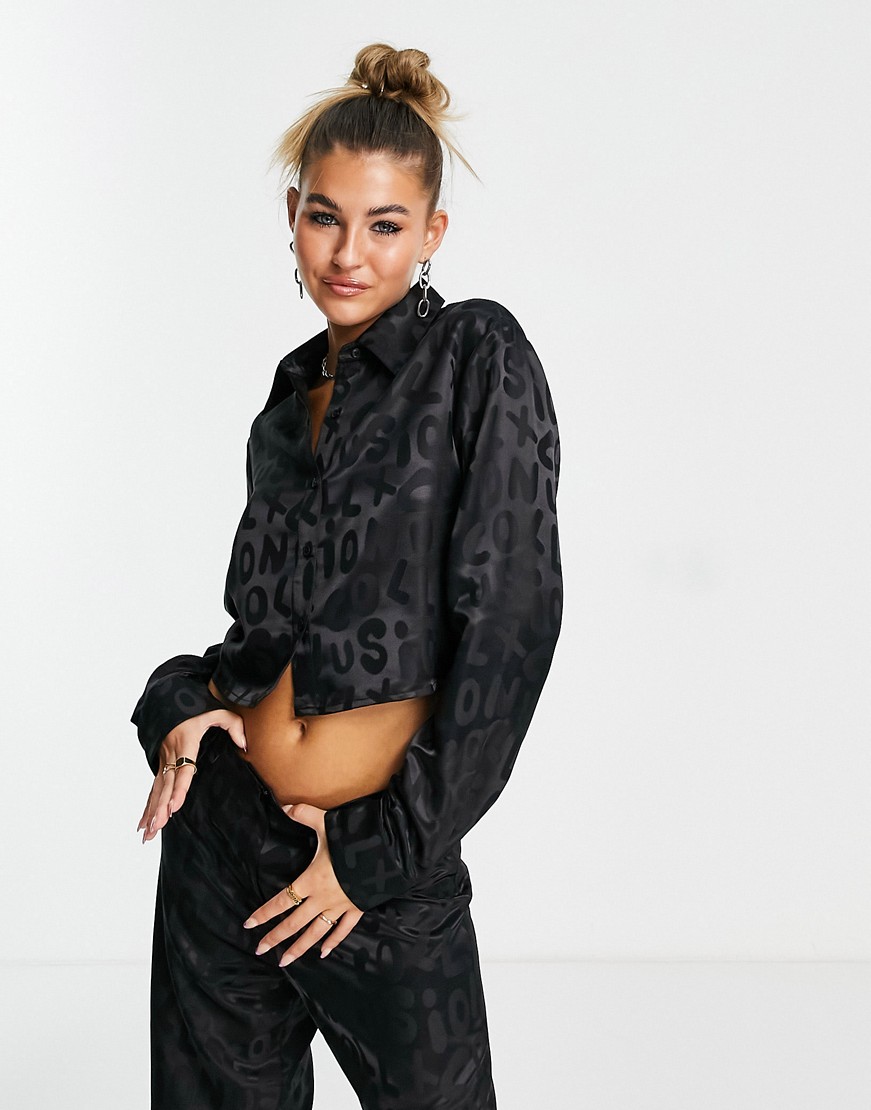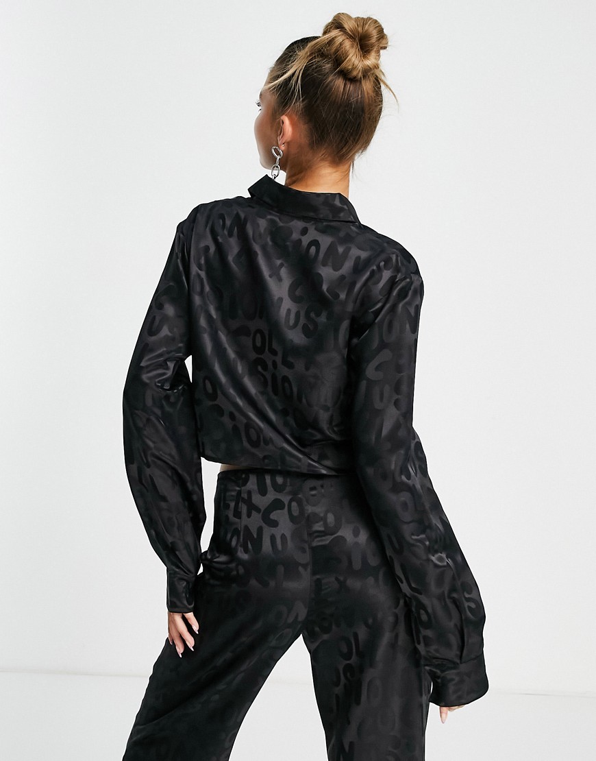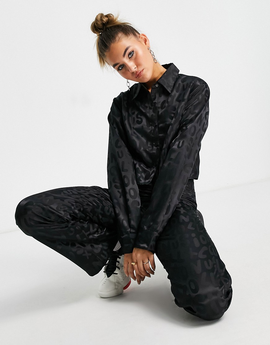 Czarna satynowa koszula o krótkim fasonie w żakardowy wzór 38