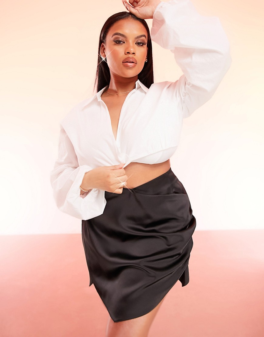 Czarna satynowa spódnica mini ze skośnym dołem 42