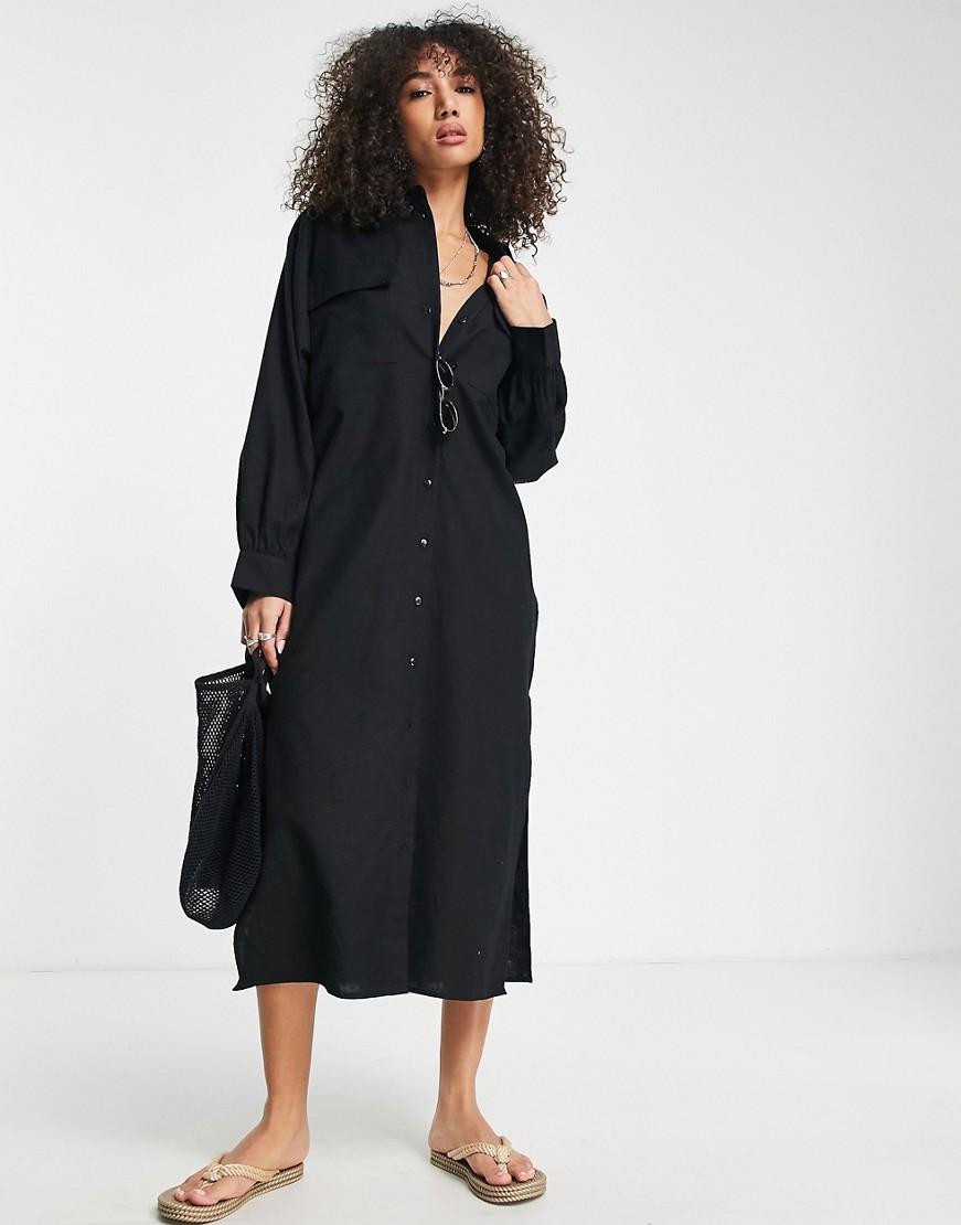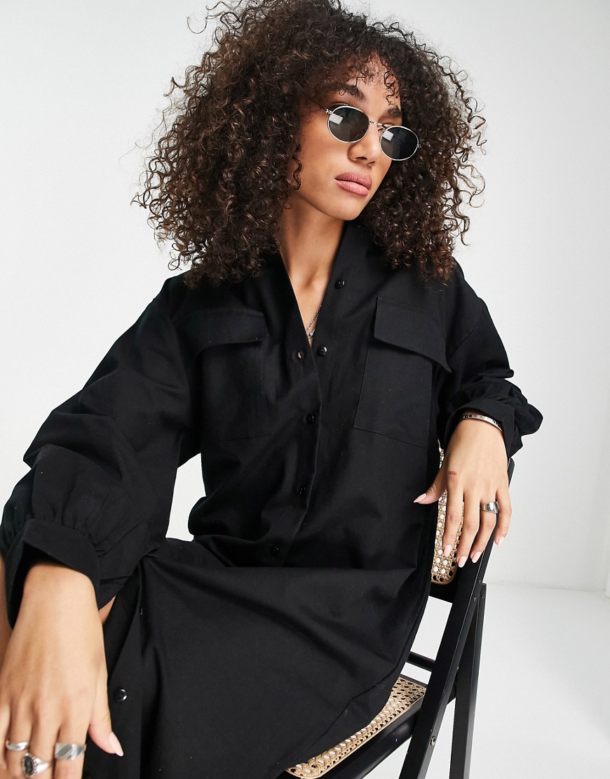 Czarna sukienka koszulowa lniana maxi prosta 38