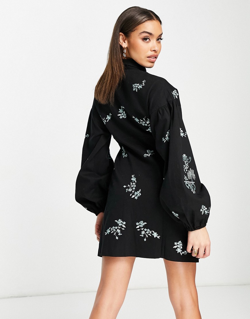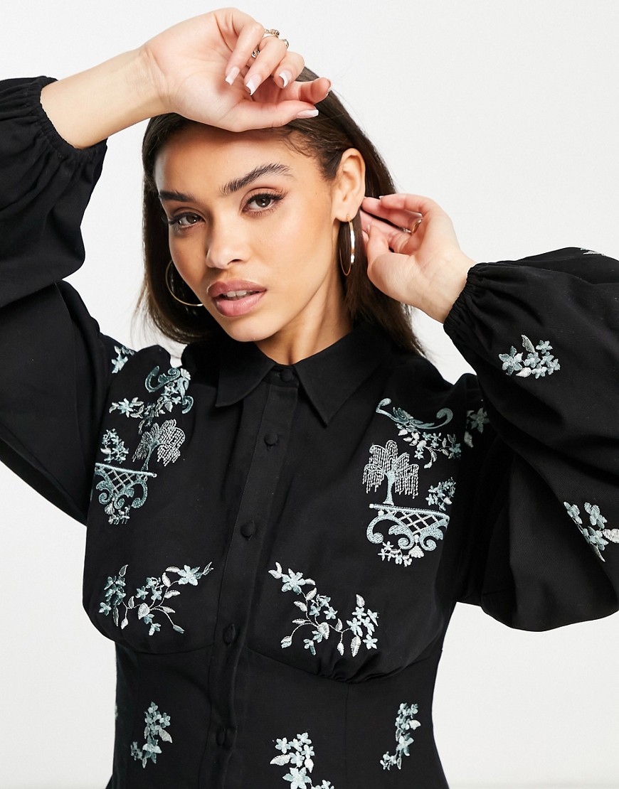 Czarna sukienka koszulowa mini z haftowanym wzorem używana 34
