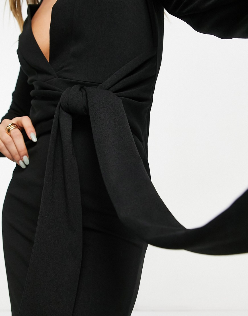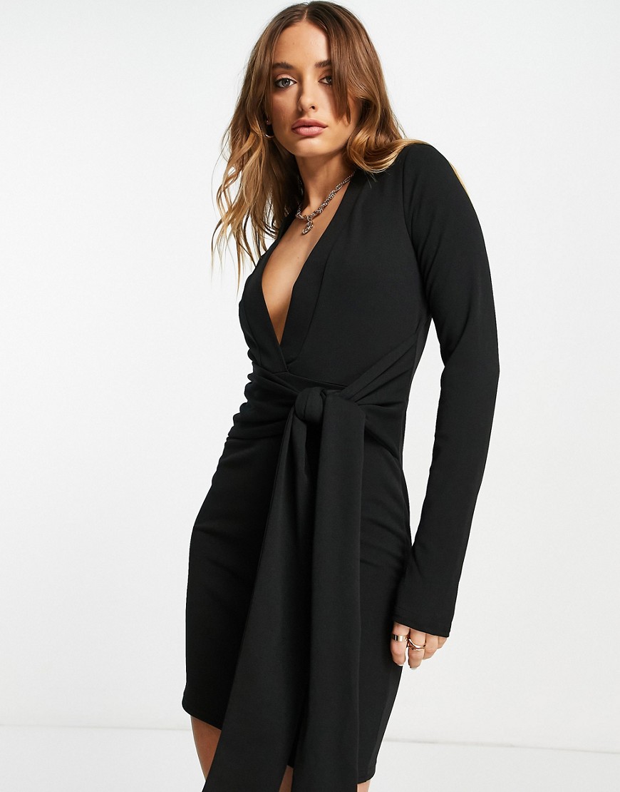 Czarna sukienka mini z głębokim dekoltem i wiązanym paskiem 36