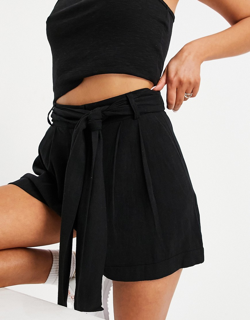 Czarne lniane damskie szorty z wiązaniem w talii 38