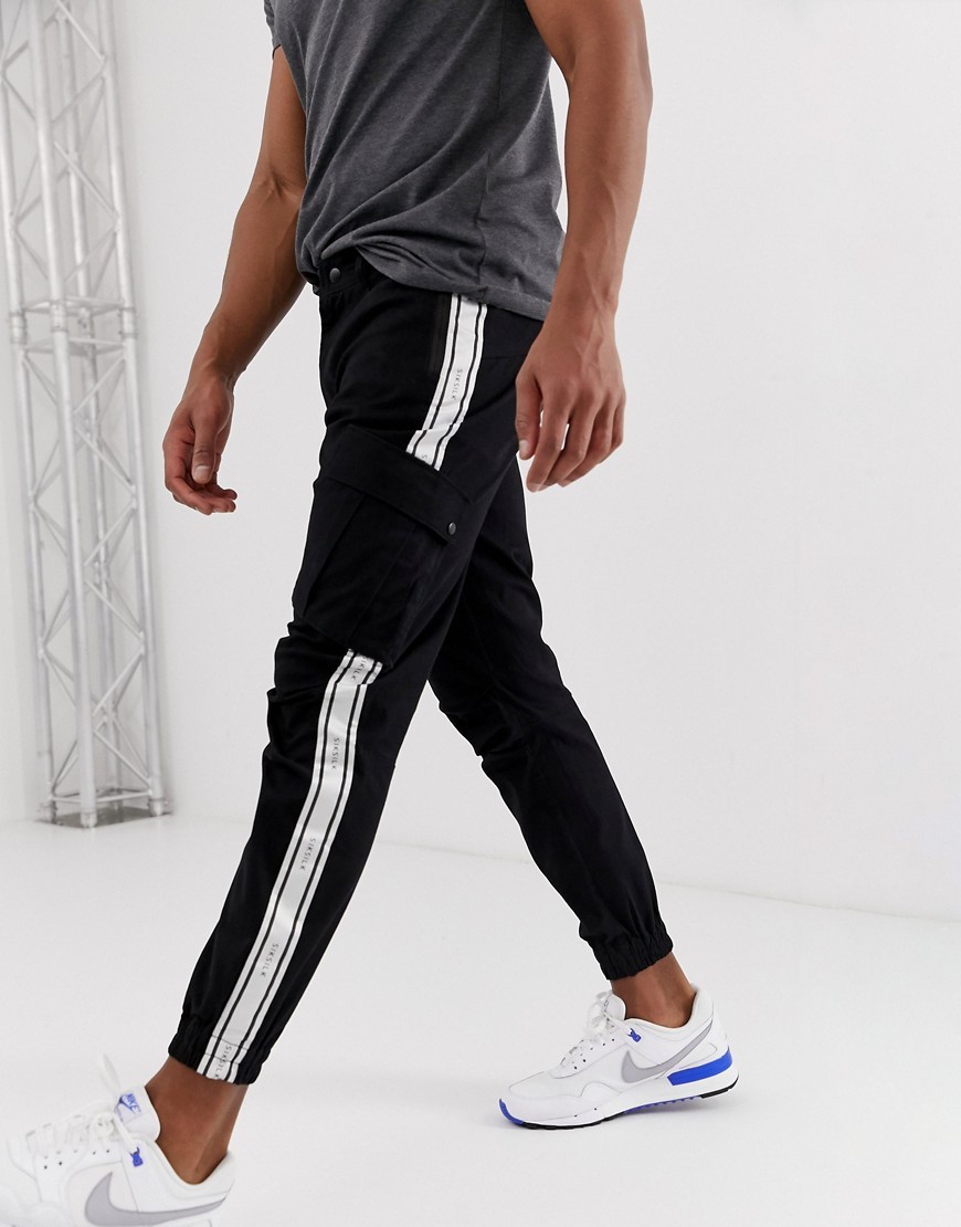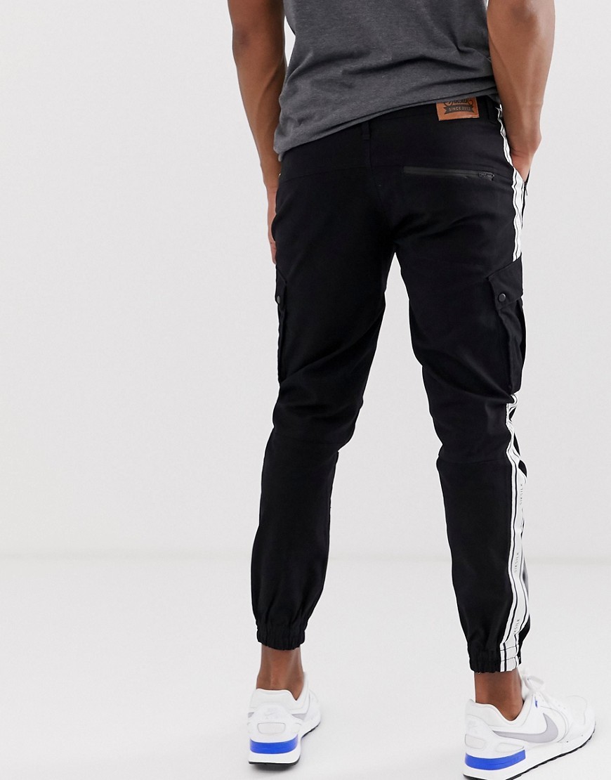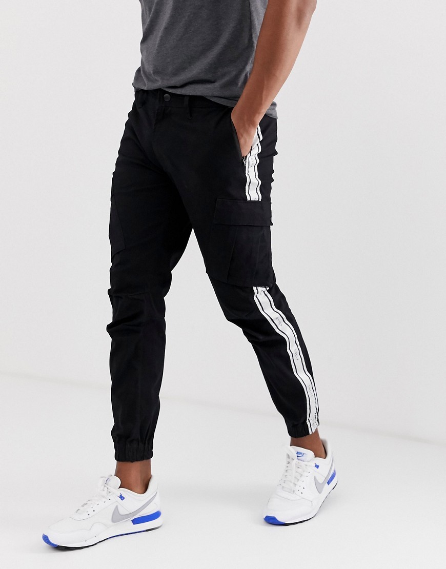 Czarne Spodnie bojówki cargo z białym lampasem L