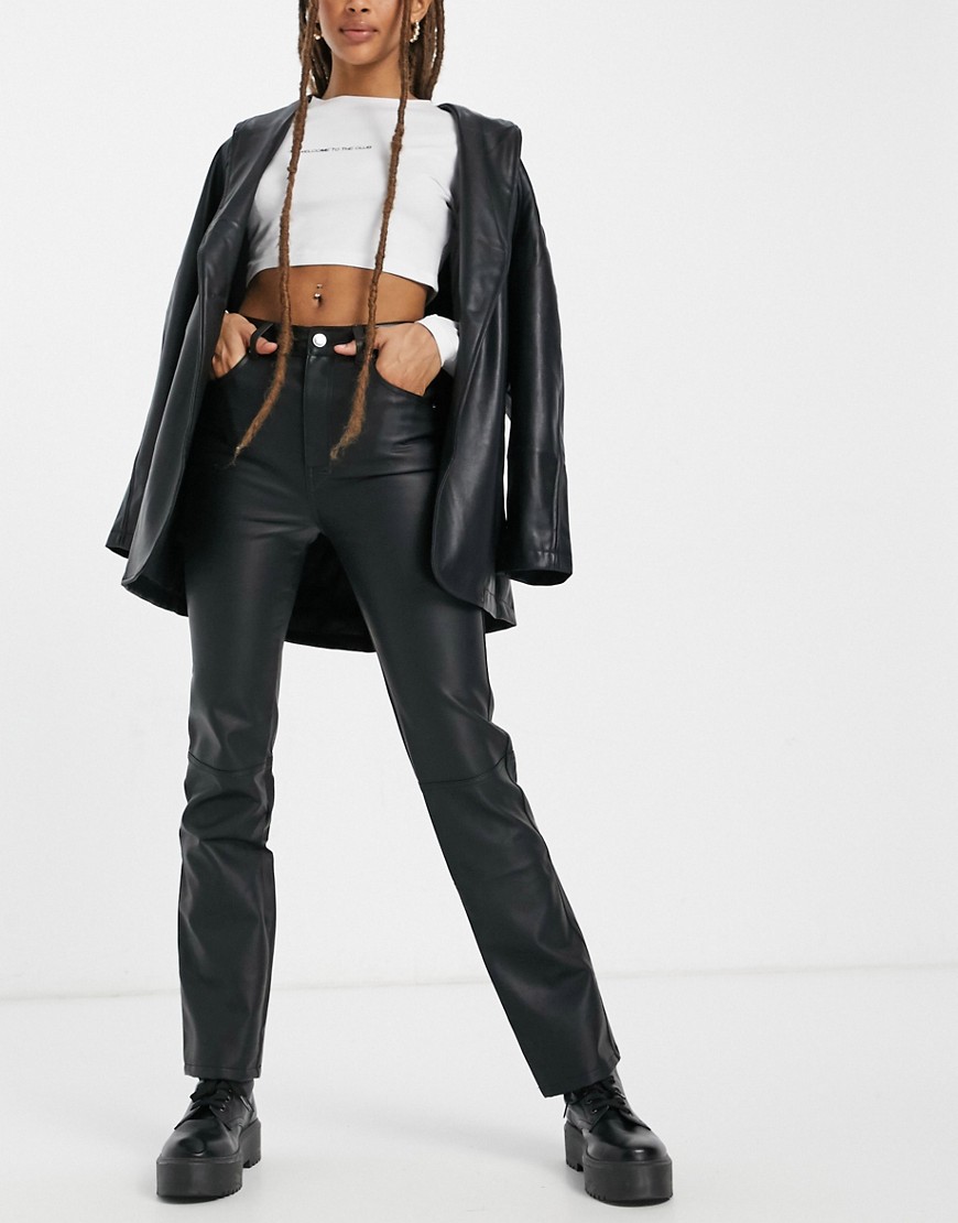 Czarne spodnie ze średnim stanem z prostymi nogawkami z imitacji skóry defekt 42