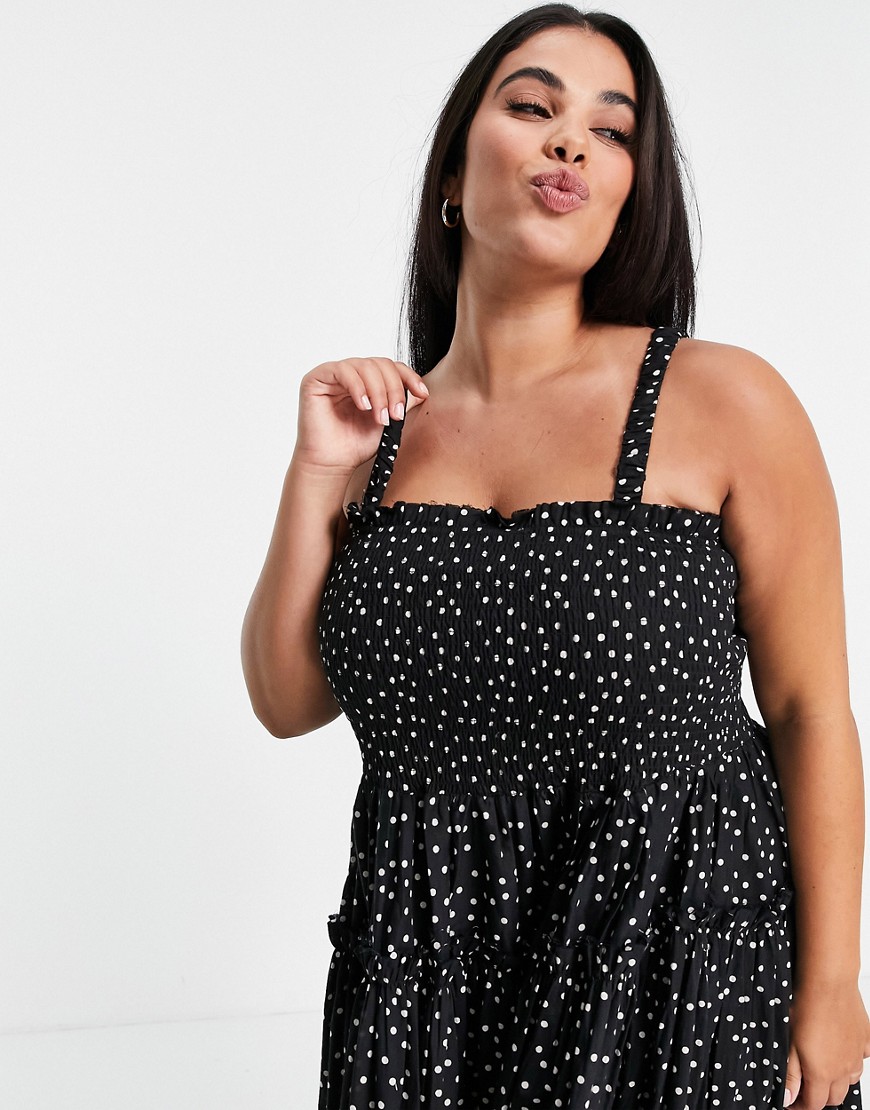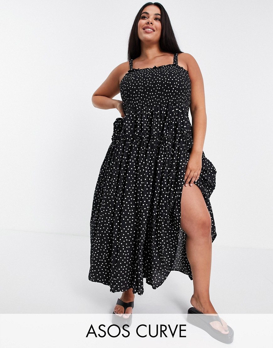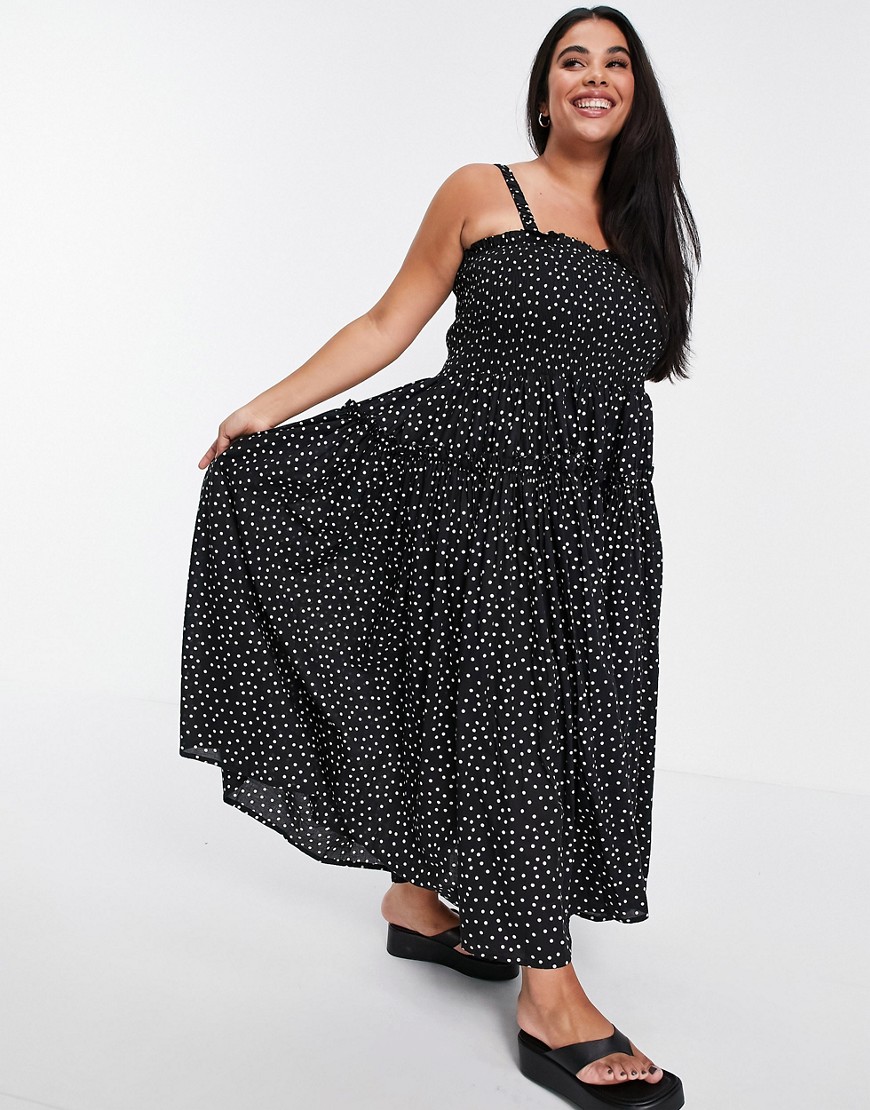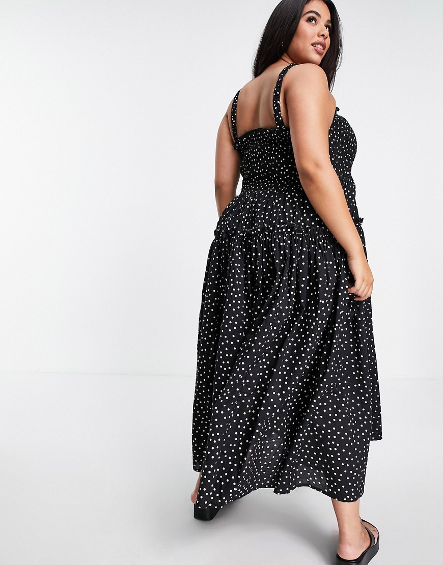 Czarno biała letnia sukienka midi na ramiączkach w groszki 46
