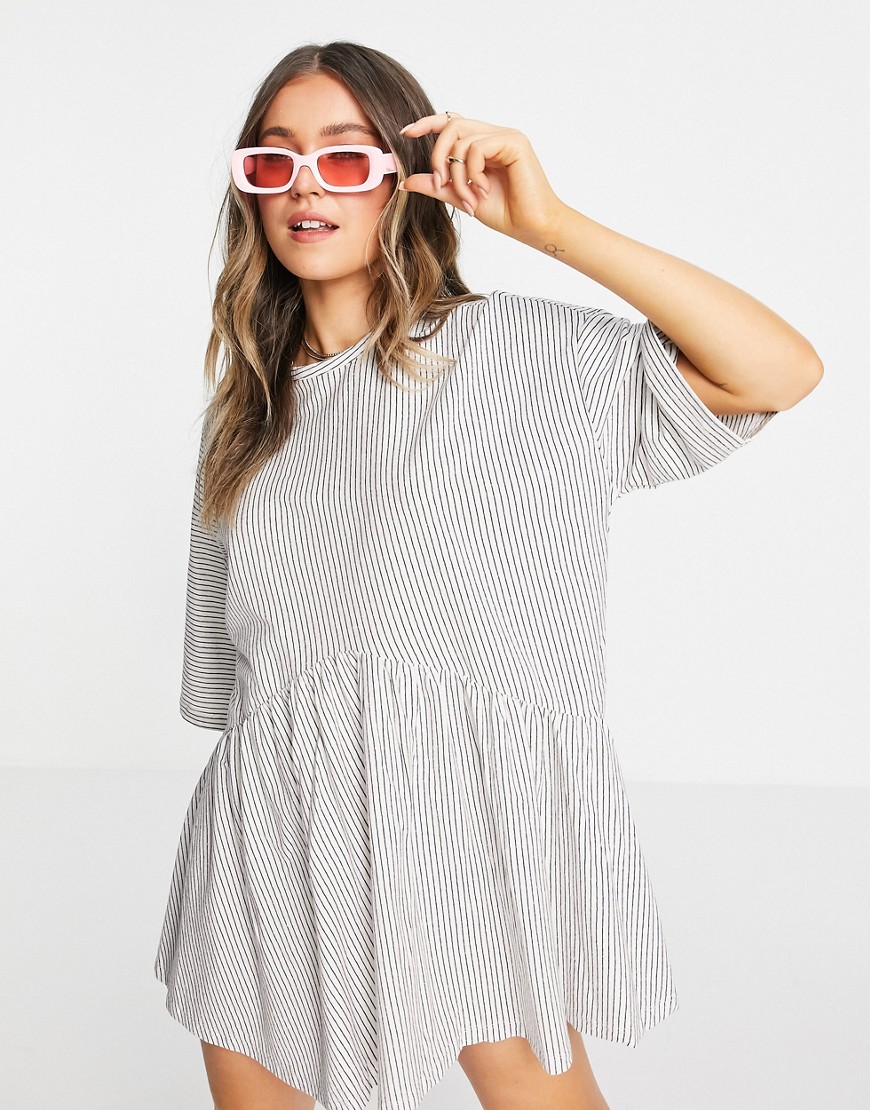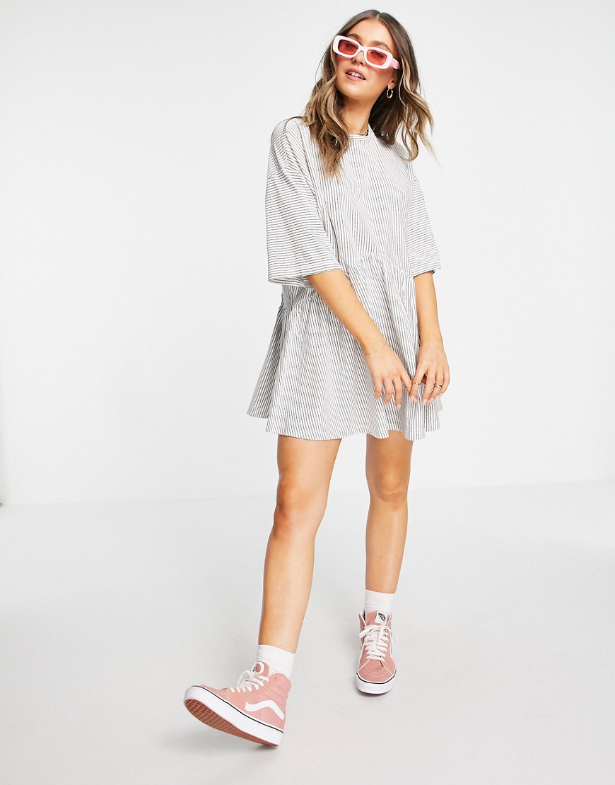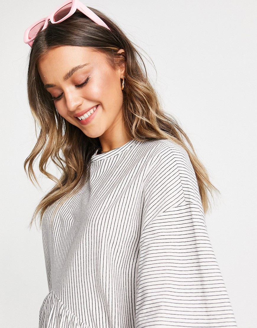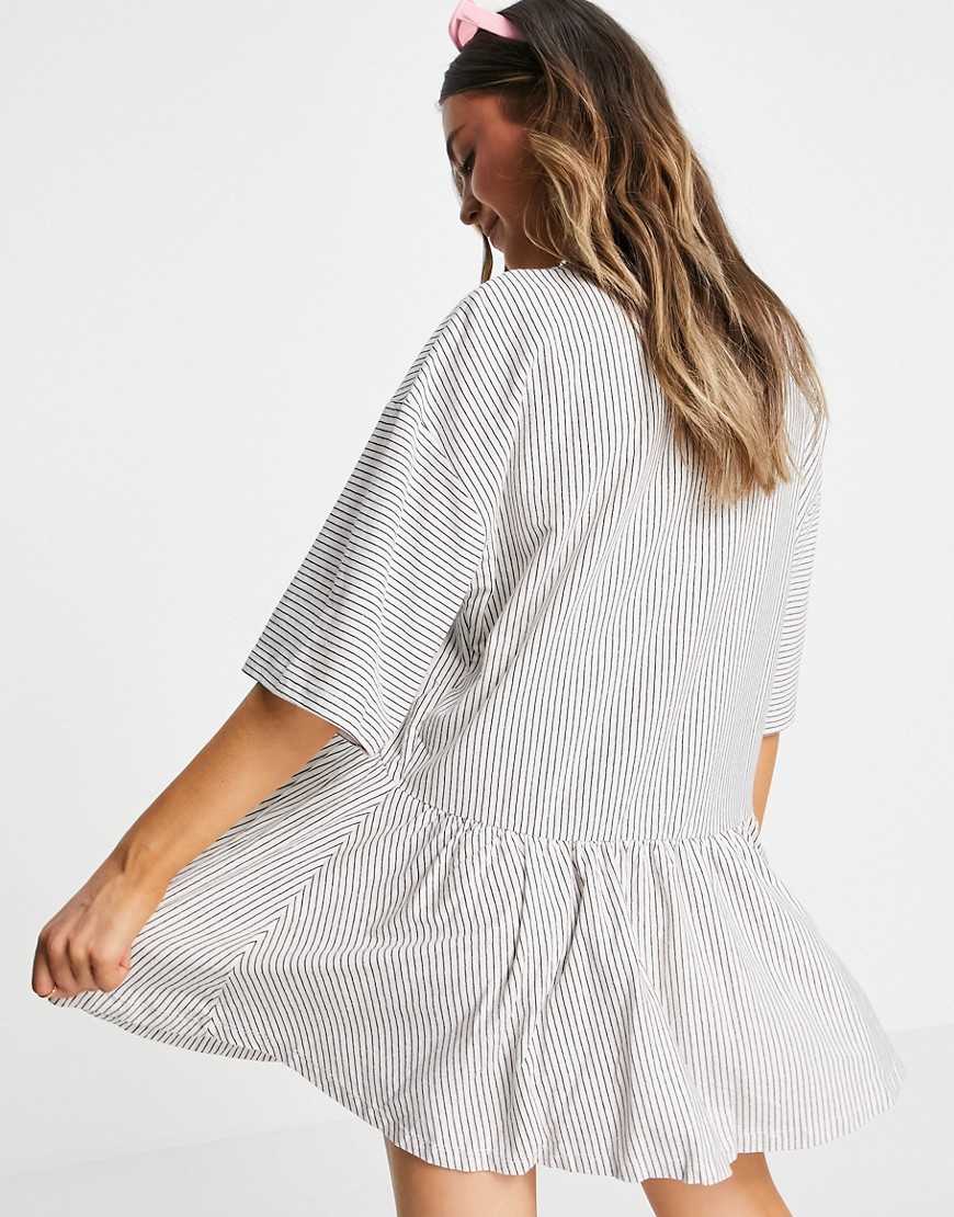 Czarno biała luźna sukienka mini oversize z obniżoną talią i wzorem w paski 32
