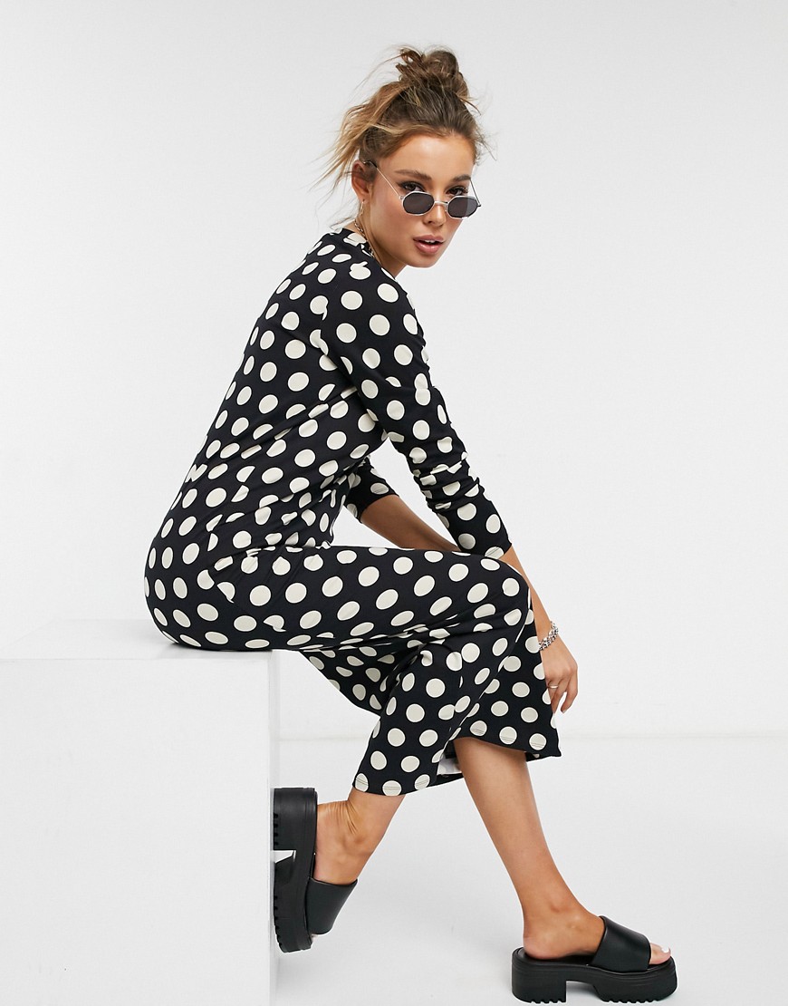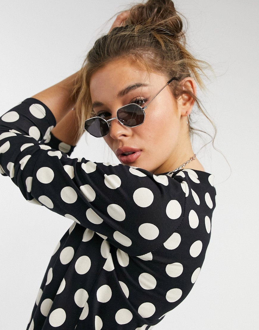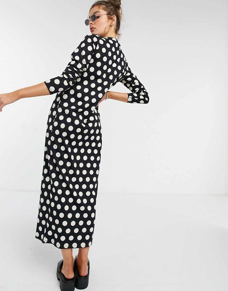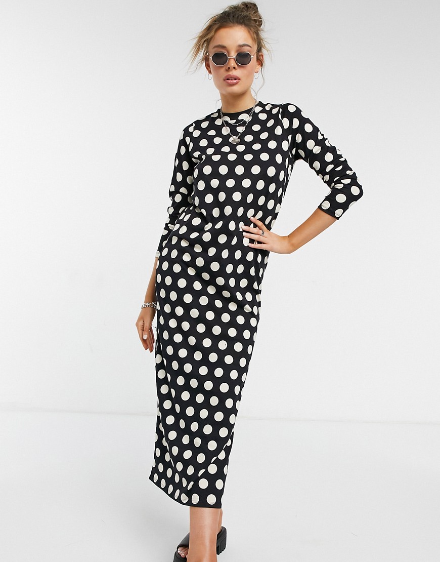 Czarns sukienka midi t-shirtowa z długimi rękawami w groszki 34