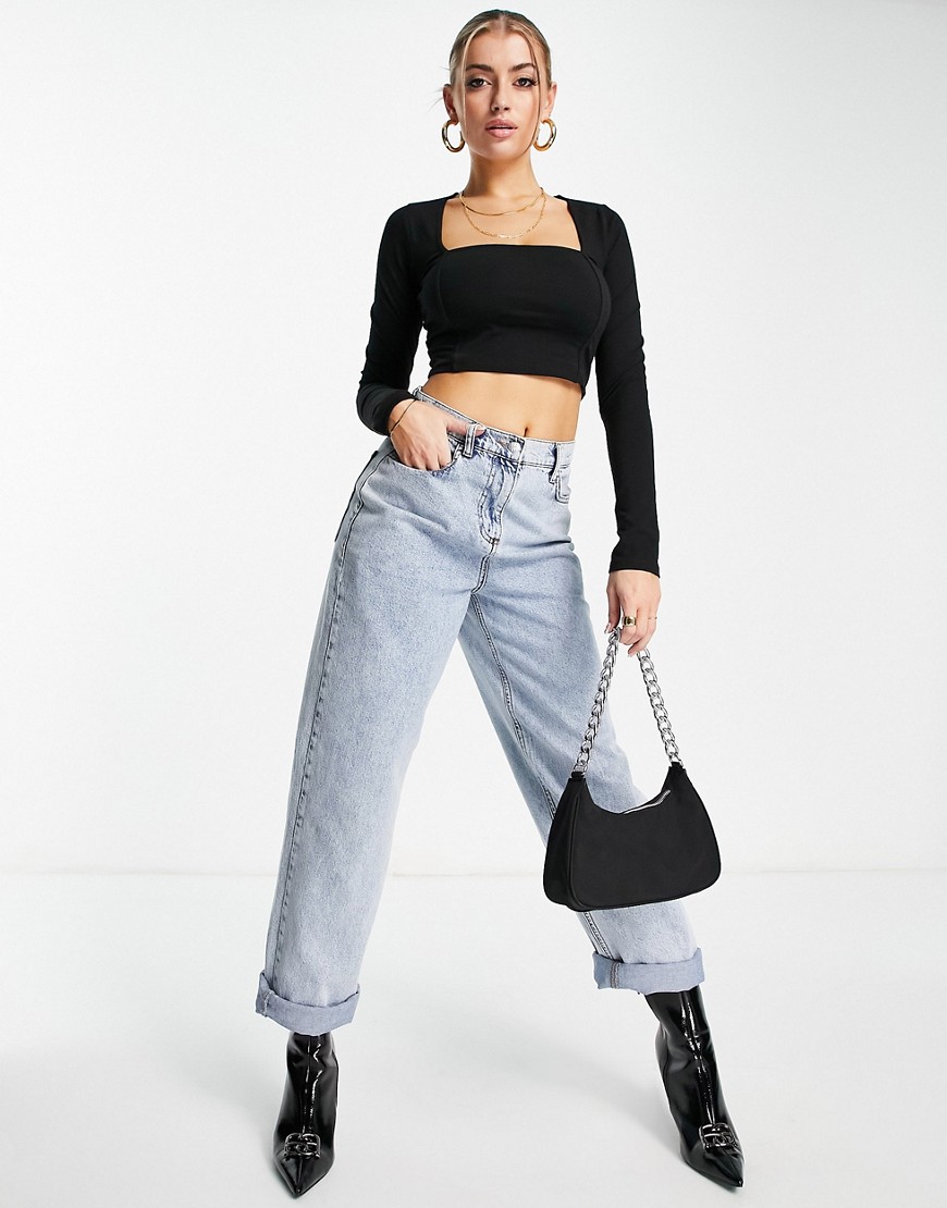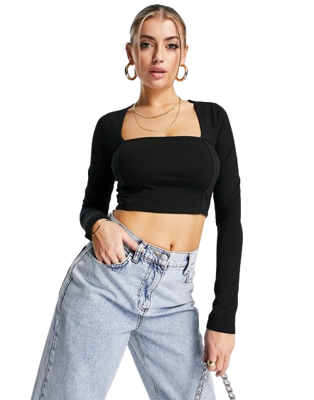 Czarny krótki top z dekoltem karo i ozdobnym przeszyciem XS