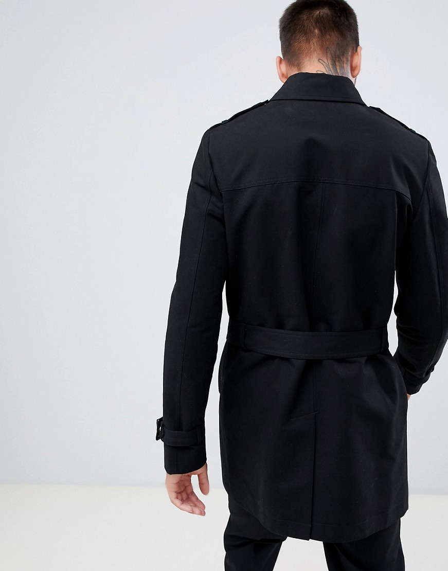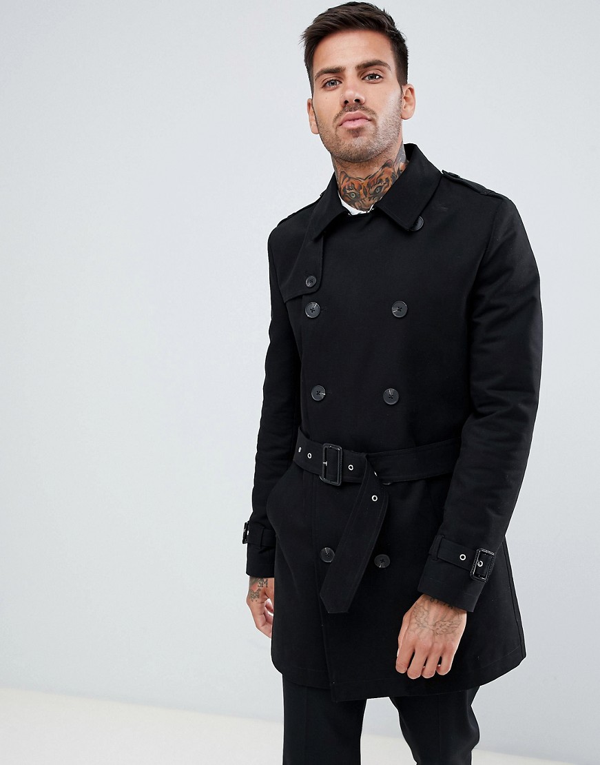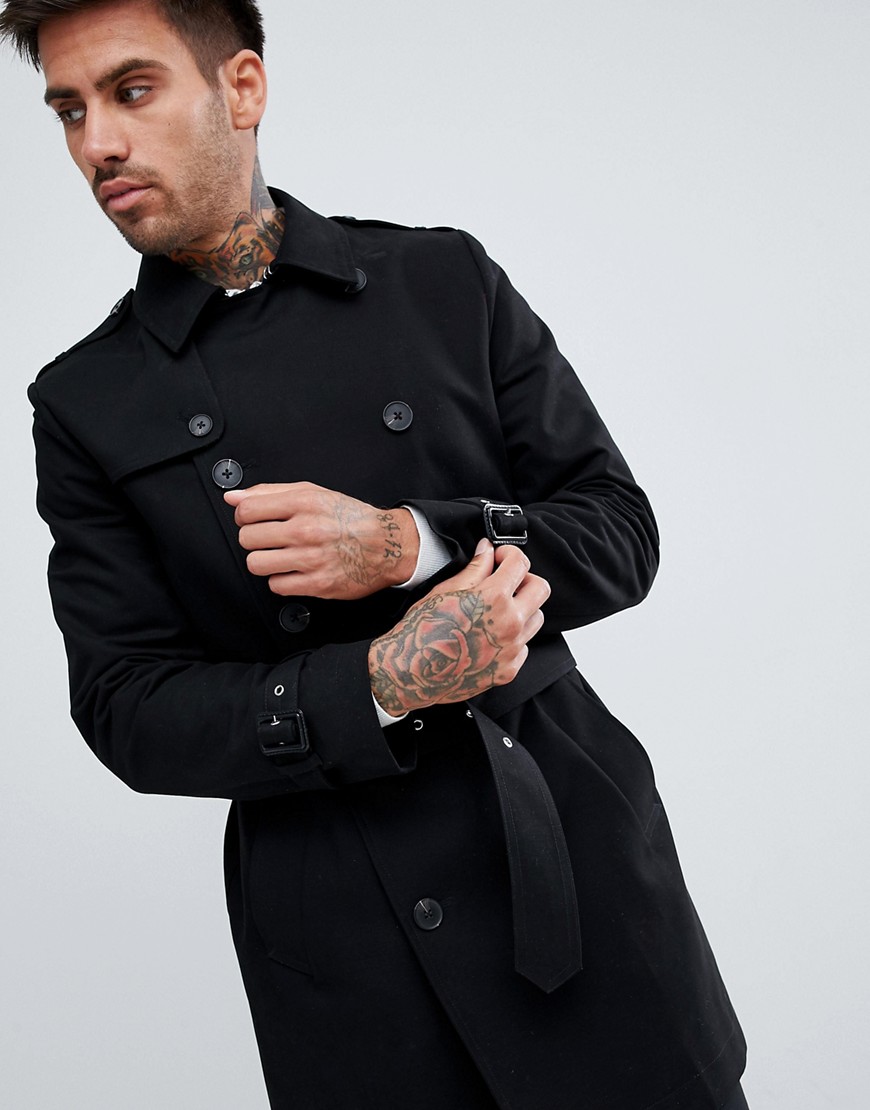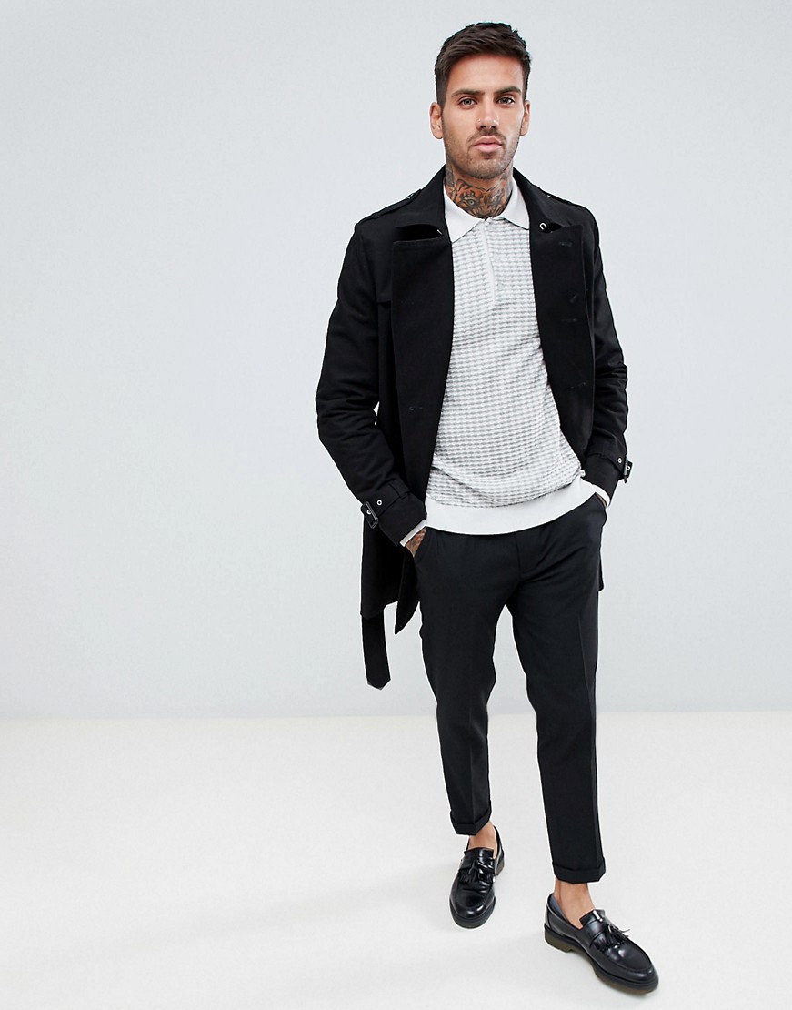 Czarny męski klasyczny elegancki płaszcz trencz M