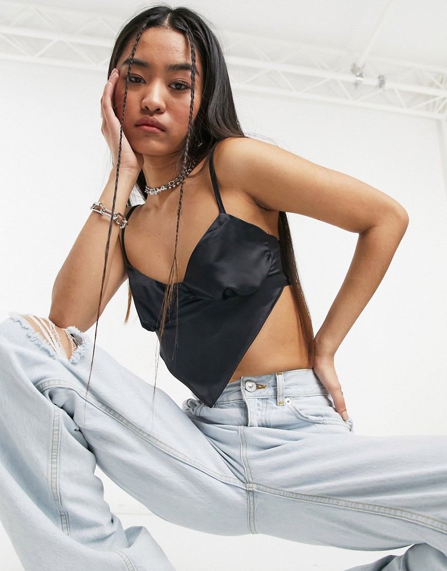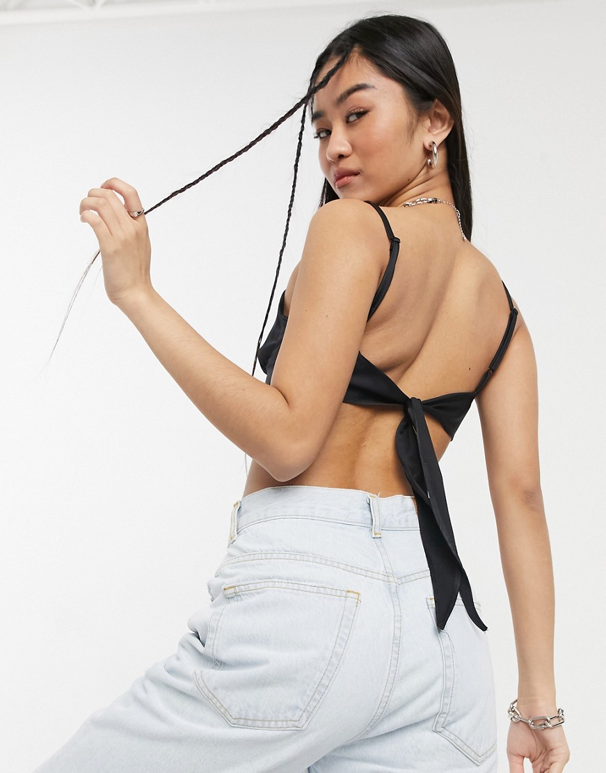 Czarny satynowy wiązany top damski z cienkimi ramiączkami i trójkątnym dołem 38