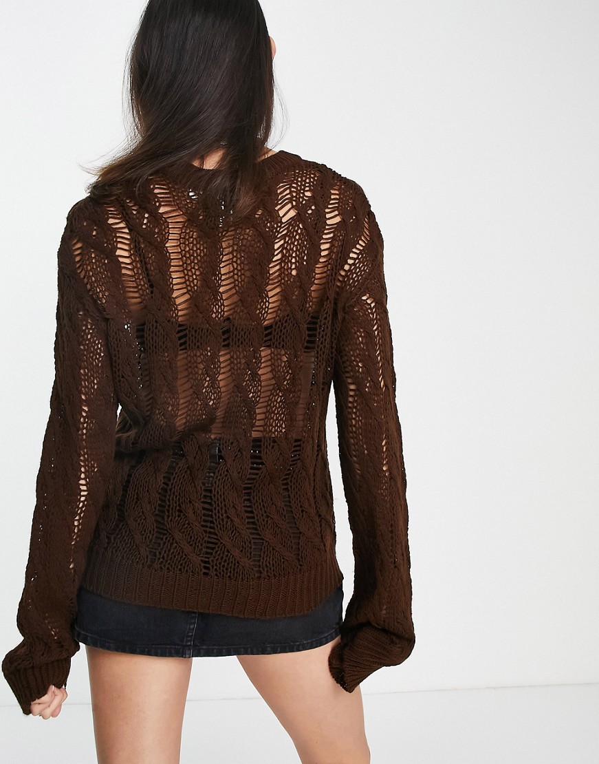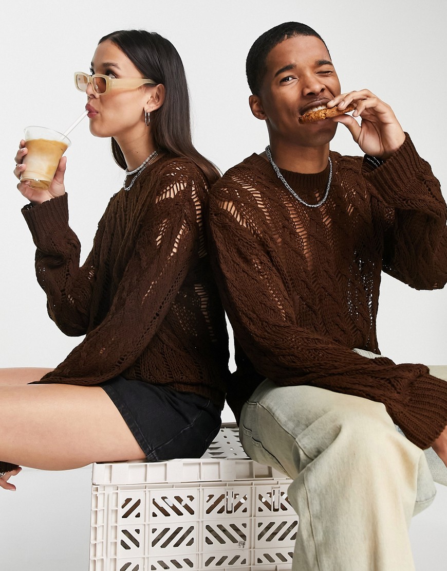 Czekoladowobrązowy dzianinowy sweter luźne splot unisex L