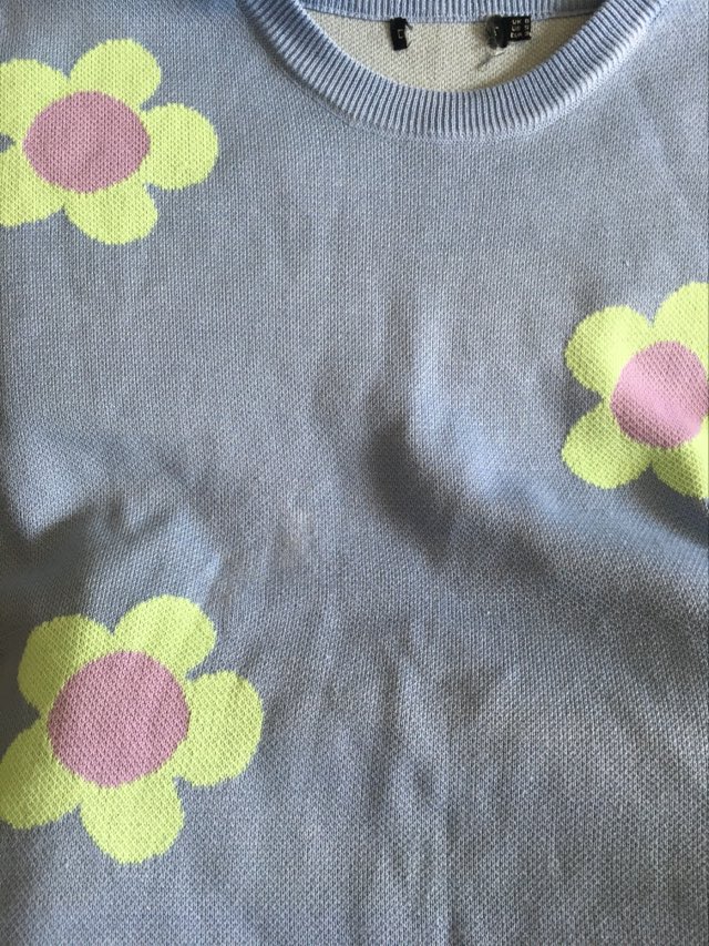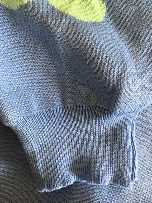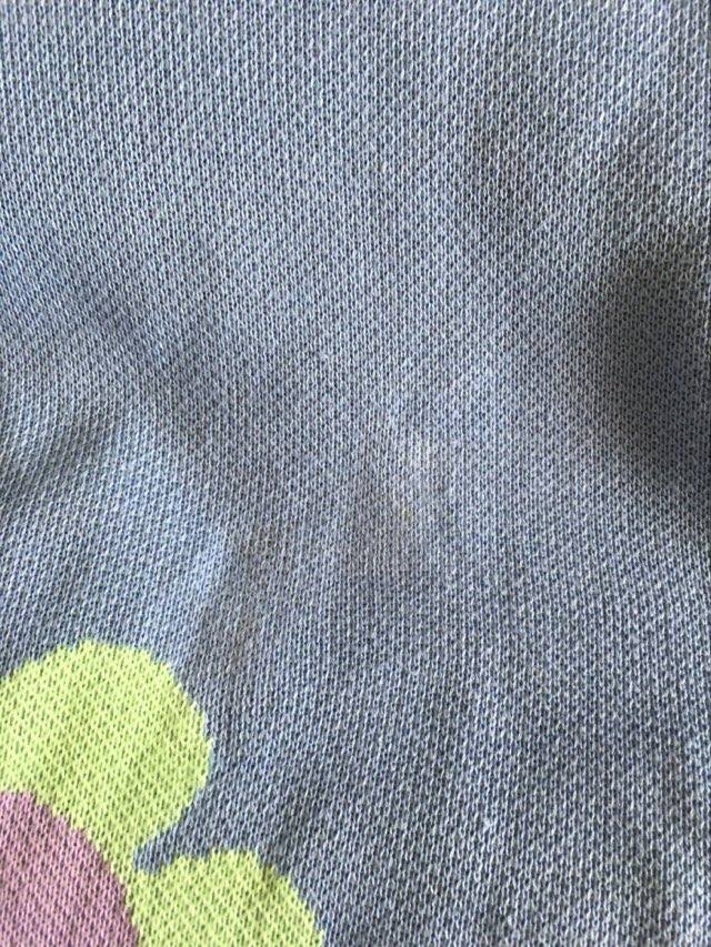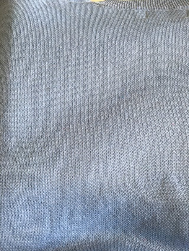 - Defekt: plama na przodzie oraz na plecach, mechacenie materiału na całości oraz rękawach – bluza nosi ślady użytkowania (zdjecia w galerii przedmiotu).