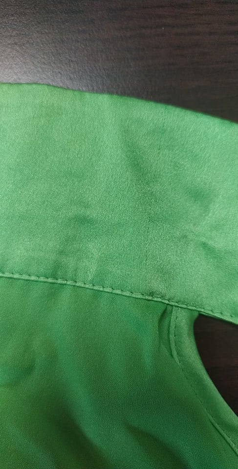 - Defekt : zaciągnięta nitka na kołnierzyku, wyświecony material z przodu, zdjęcie w galerii produktu