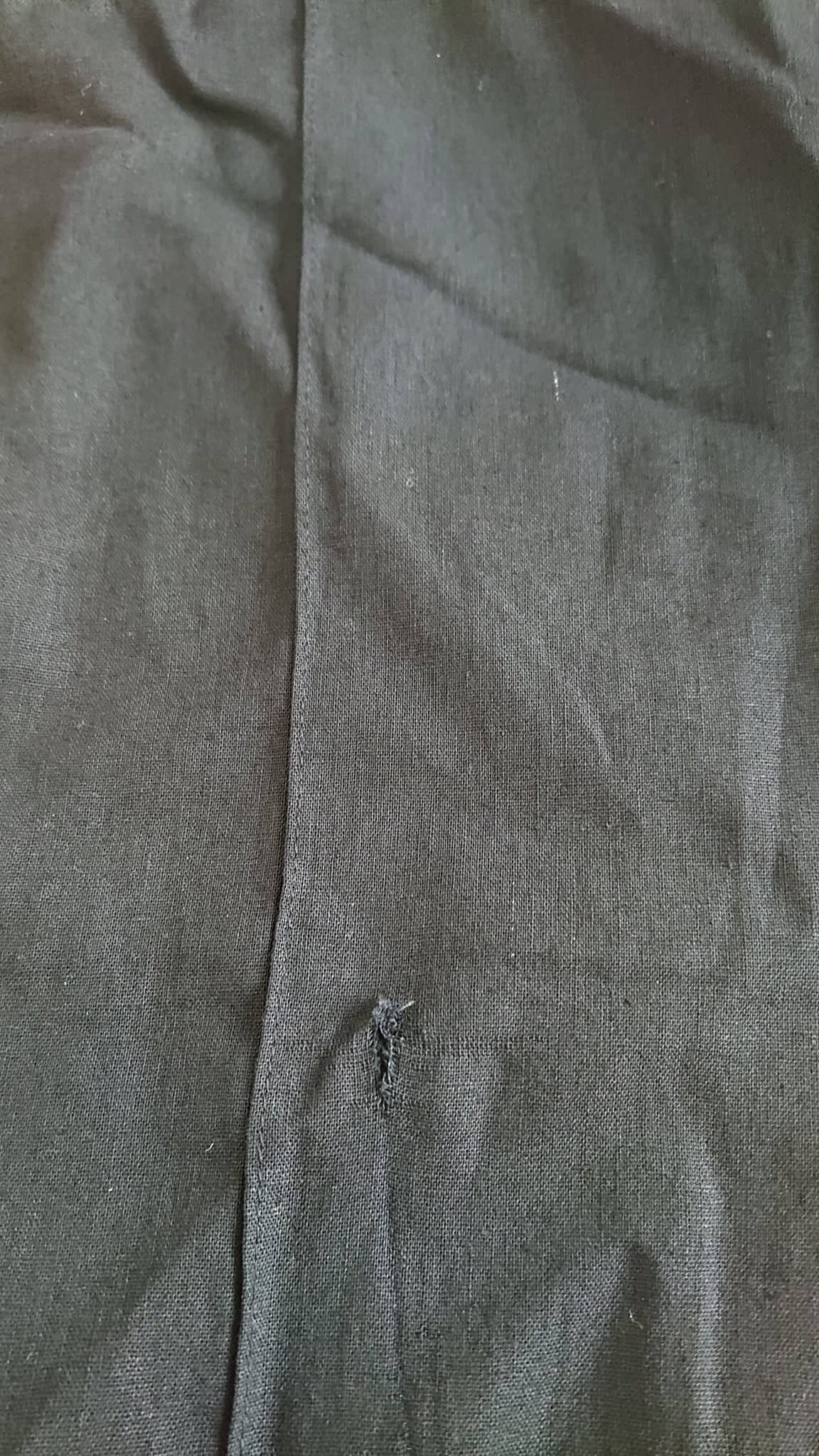 • DEFEKT: Z przodu na prawym kolanie dziura i niewielka skaza na materiale