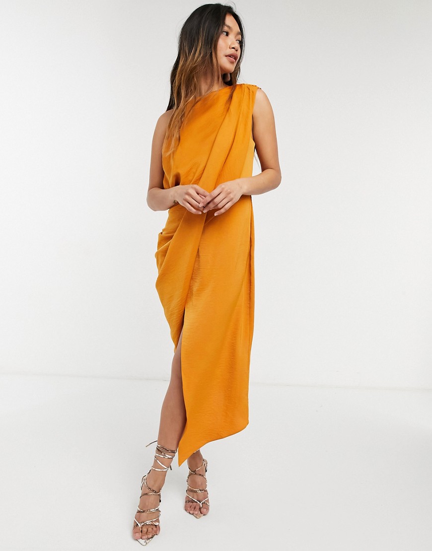 Drapowana sukienka midi z miękkiej teksturowanej krepy żółta 32