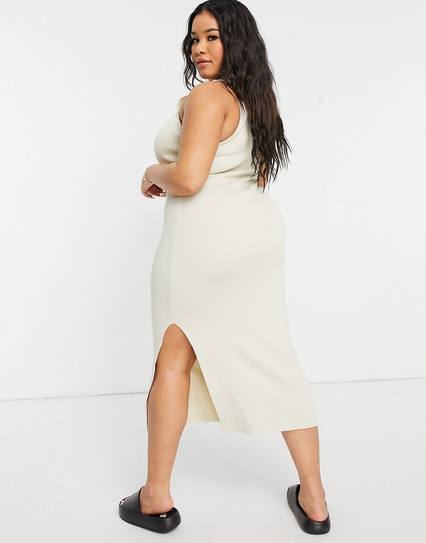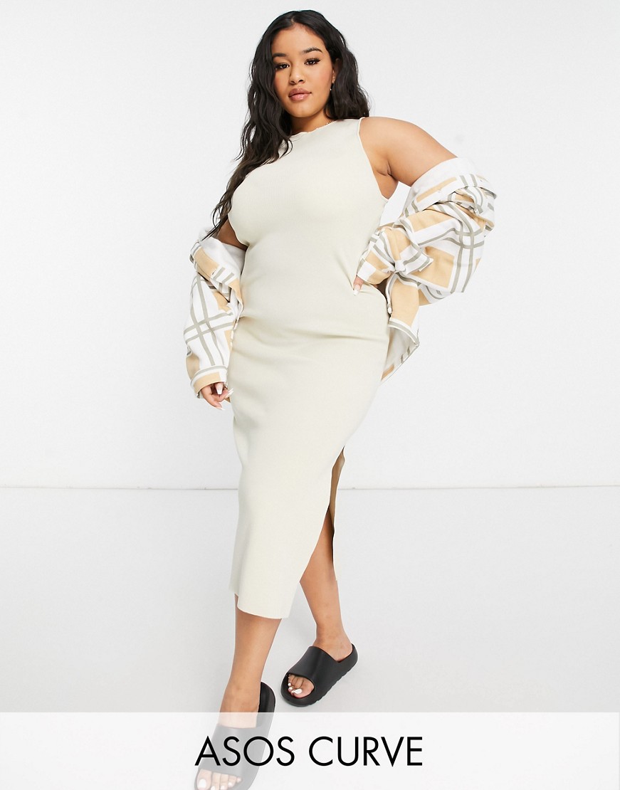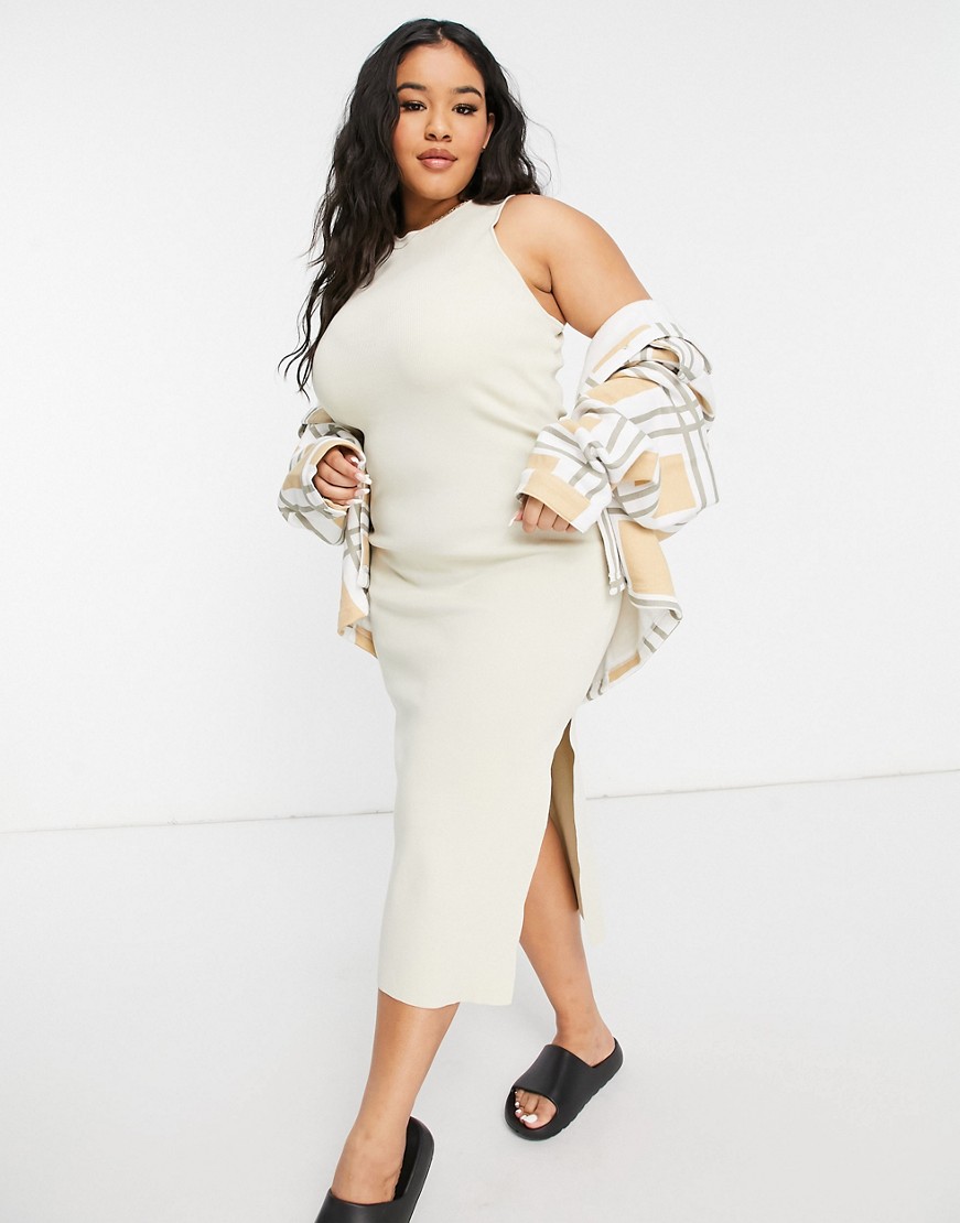 Dzianinowa sukienka midi z rozcięciem z boku beżowa 46