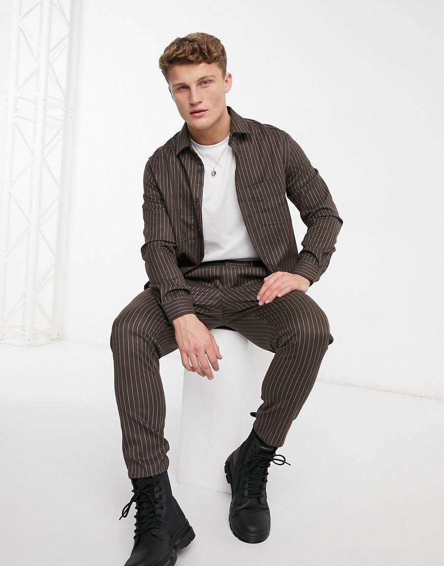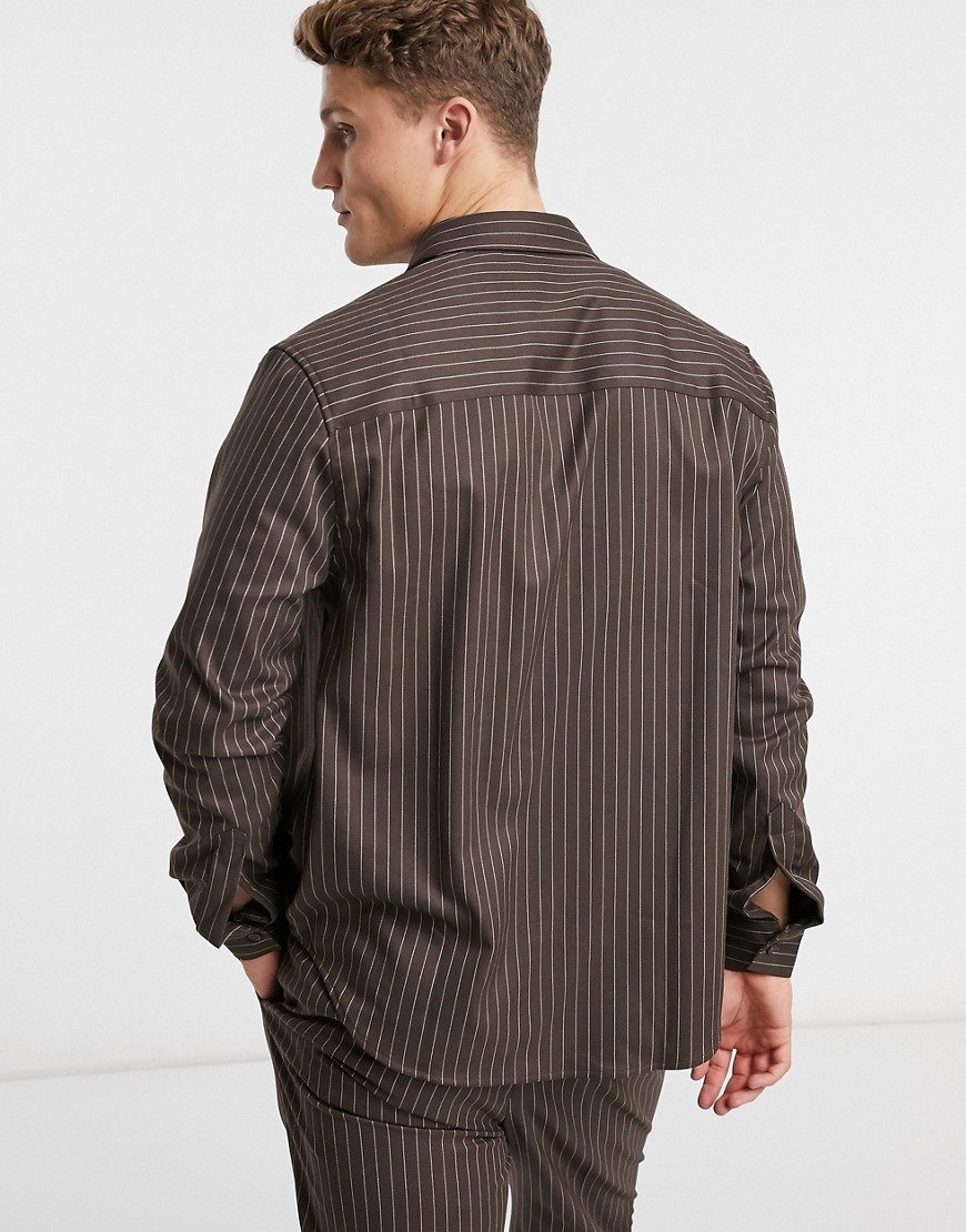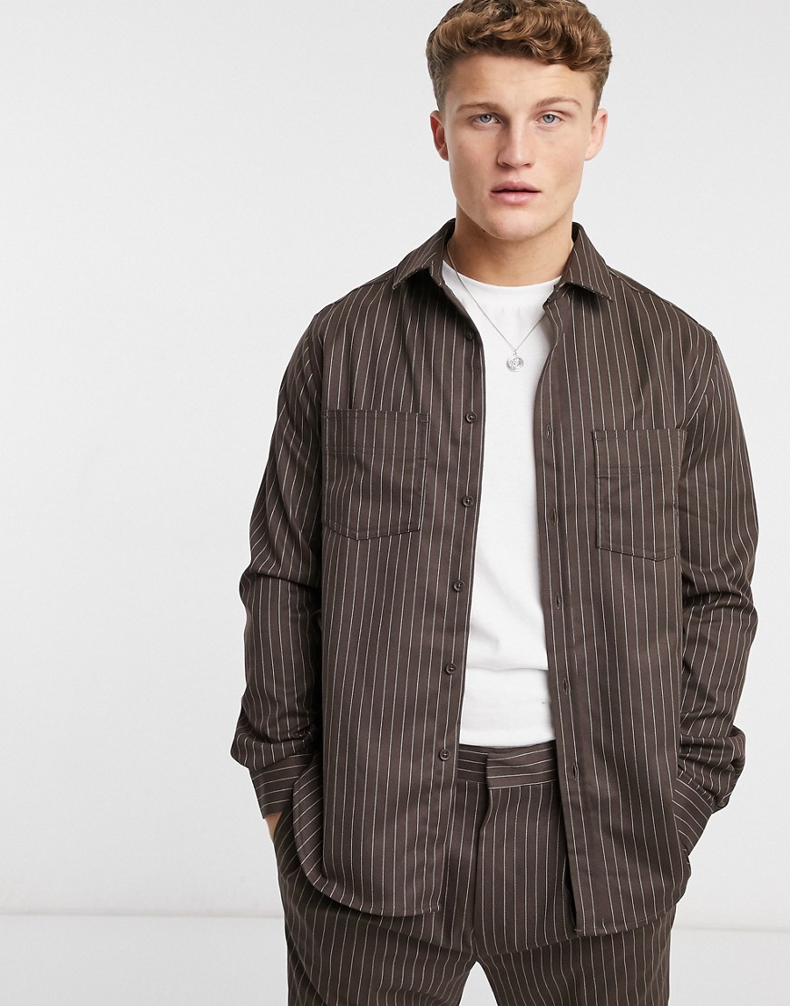 Elegancki brązowy overshirt w prążki, część zestawu L