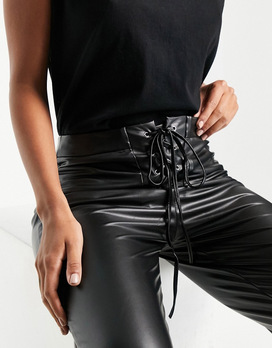 Femme Luxe Skóropodobne czarne spodnie o obcisłym kroju z wiązaniem 40
