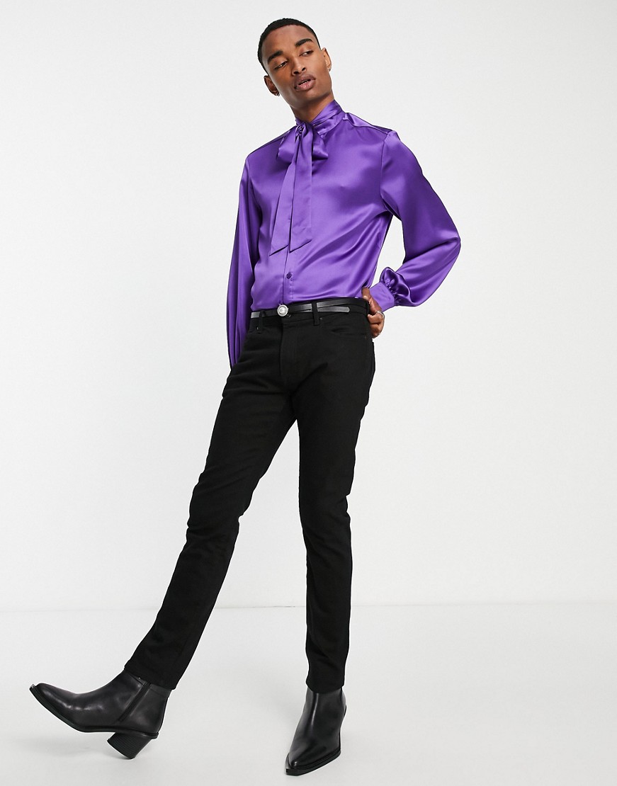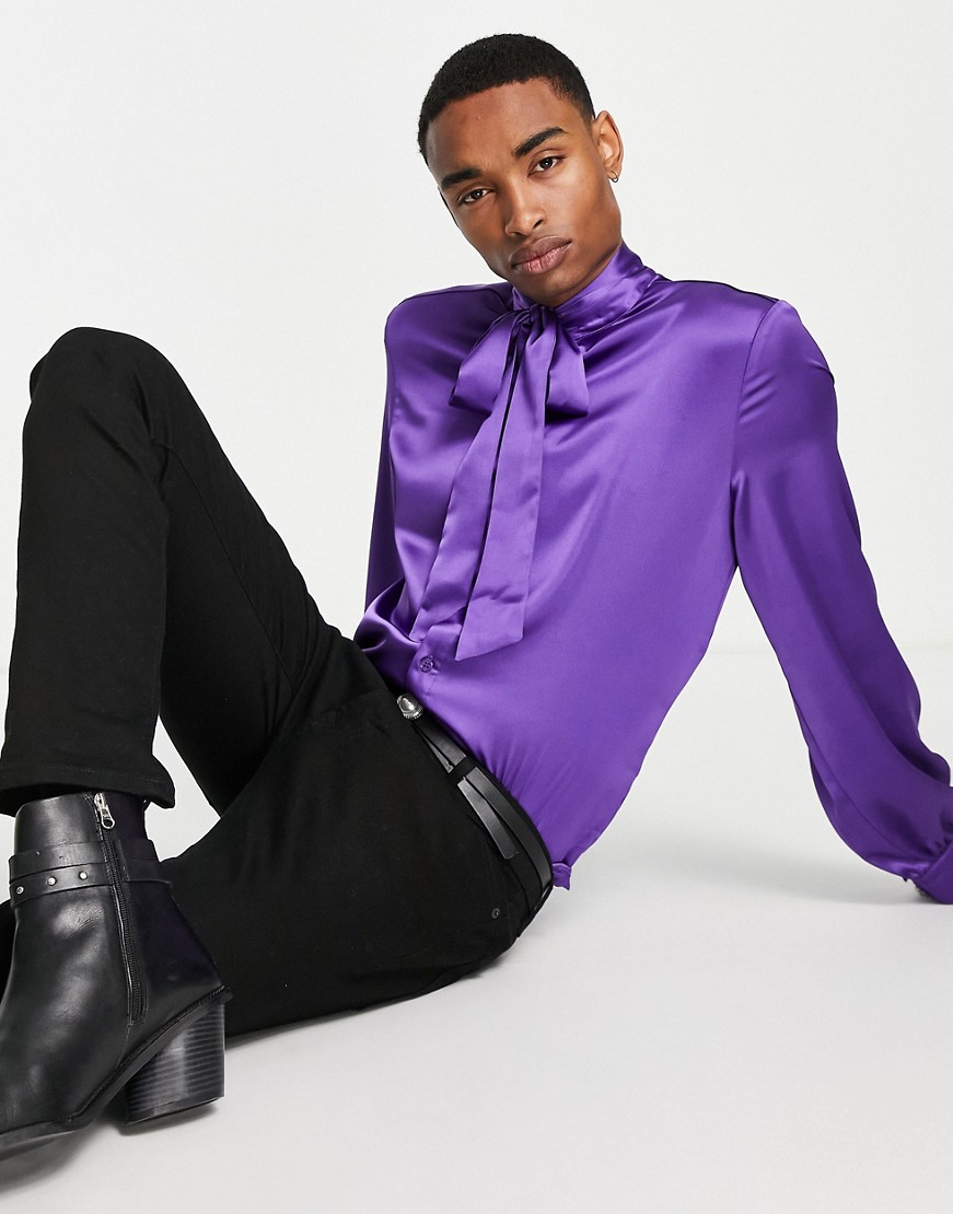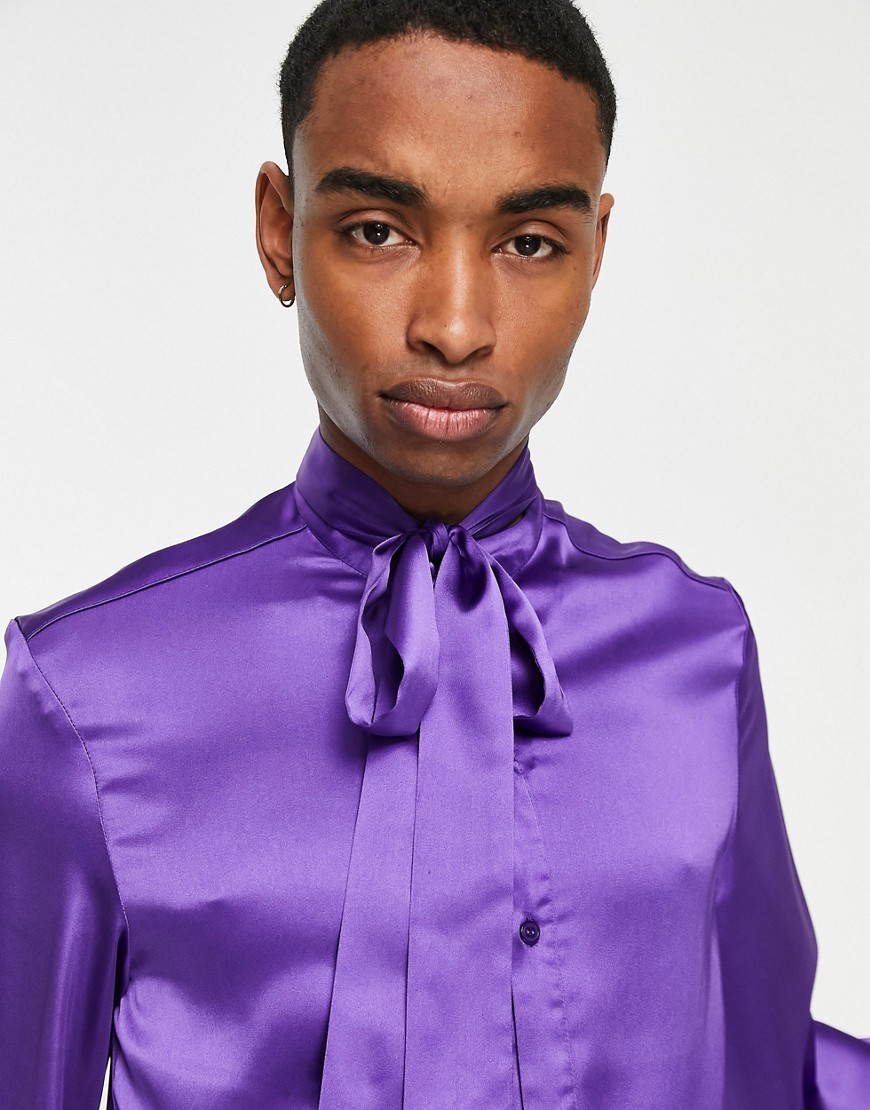 Fioletowa satynowa koszula z wiązaniem przy szyi S