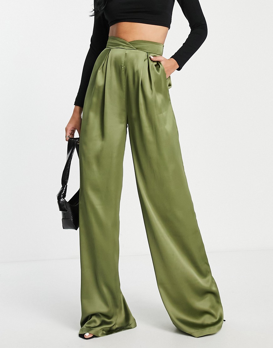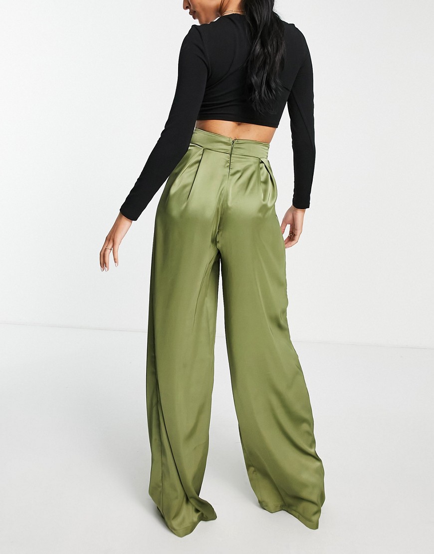 First Distraction Tall zielone satynowe spodnie podwyższony stan szerokie nogawki wide leg 36