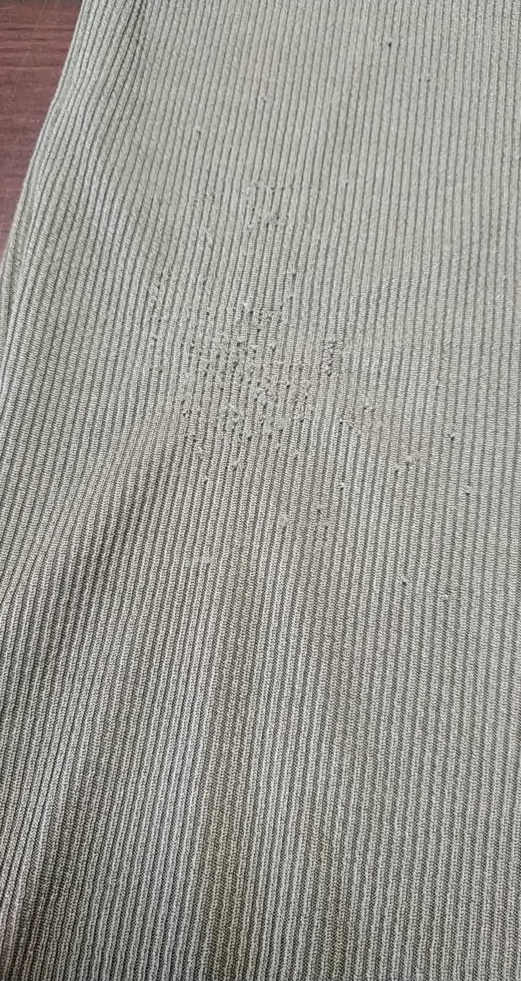 - defekt zaciągnięcia i zmechacenie materiału przy prawym boku mniej więcej na środku
