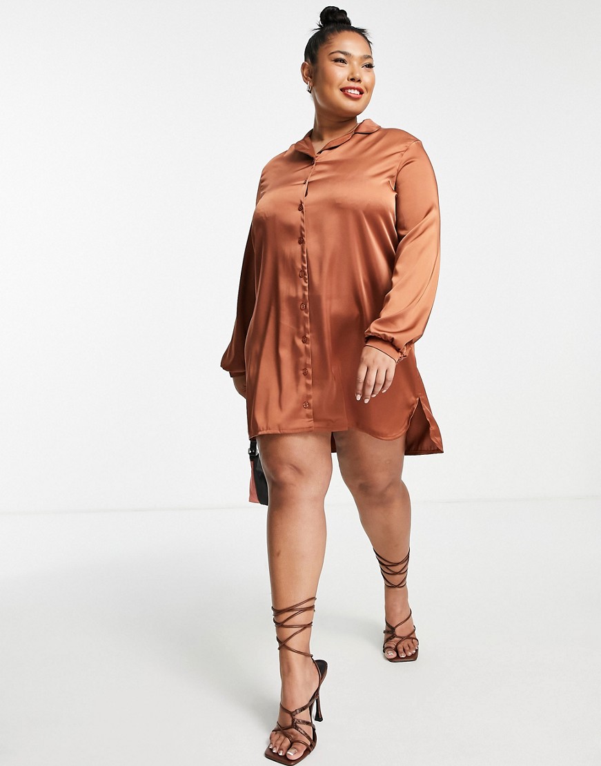 Flounce London Plus czekoladowobrązowa satynowa sukienka mini 50