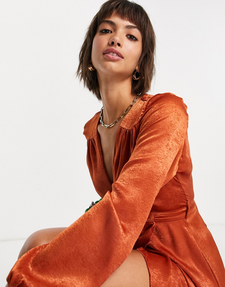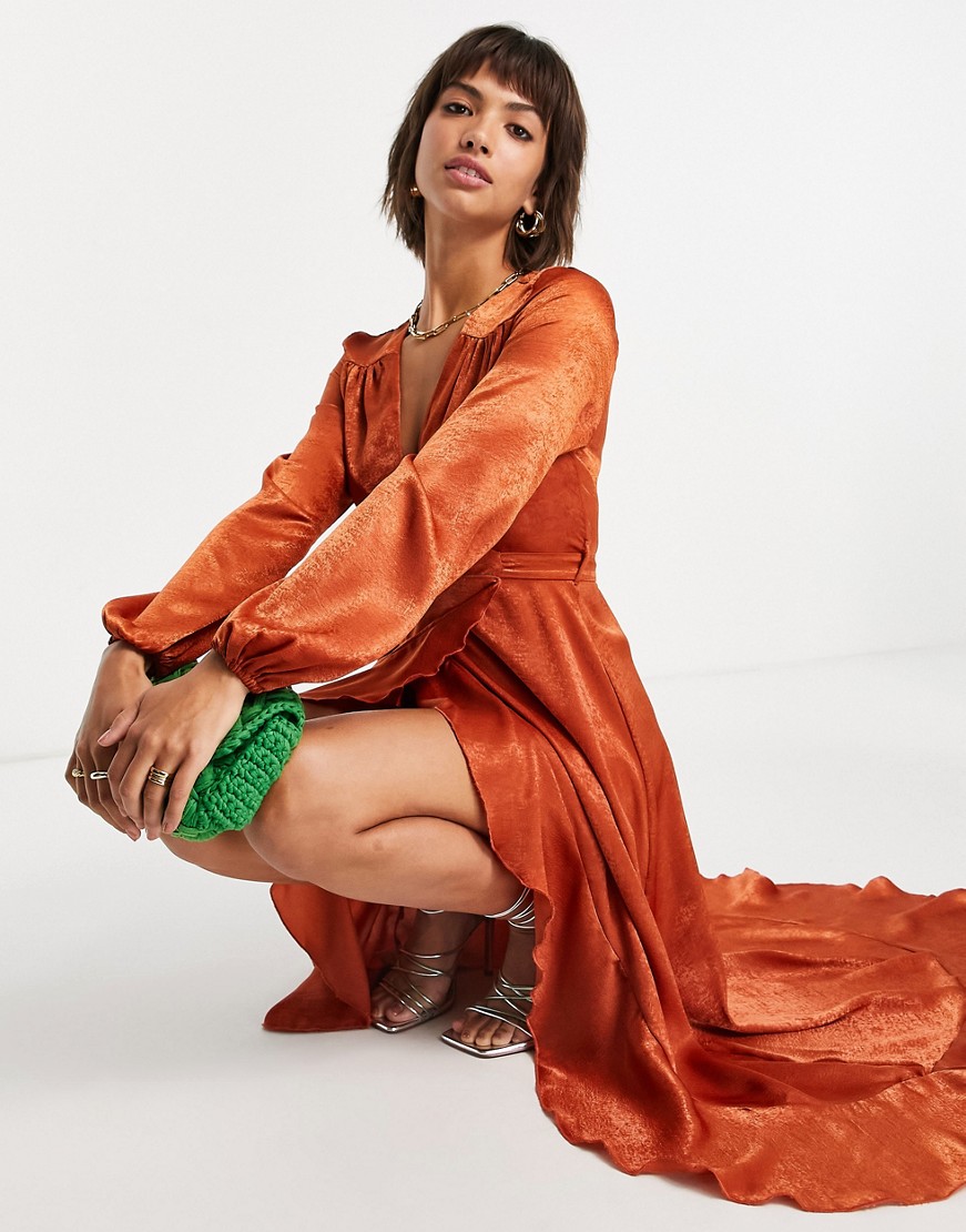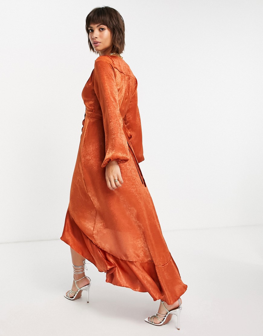 Flounce London satynowa kopertowa sukienka maxi z długimi rękawami pomarańczowa 38