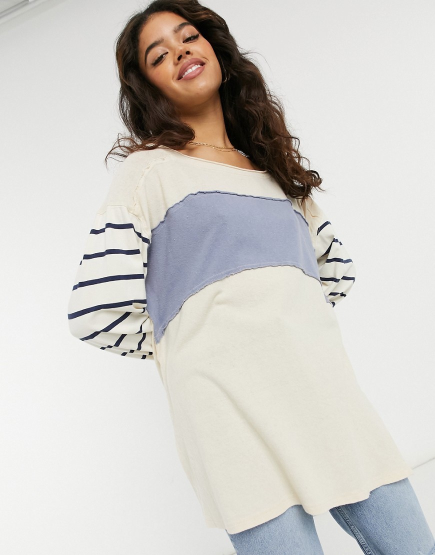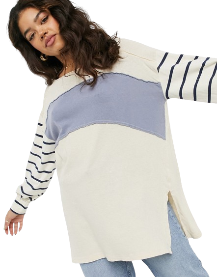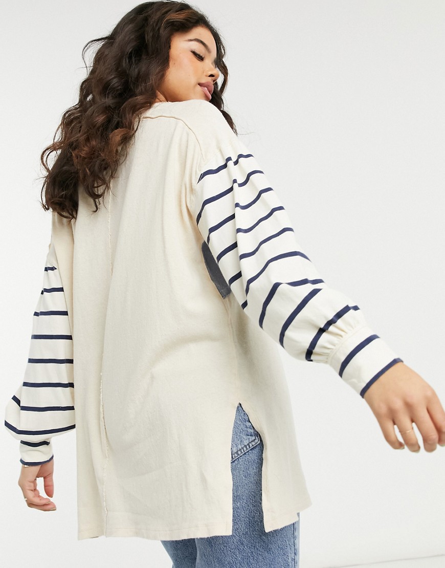 Free People cienki beżowy dzianinowy sweter oversize patchwork M