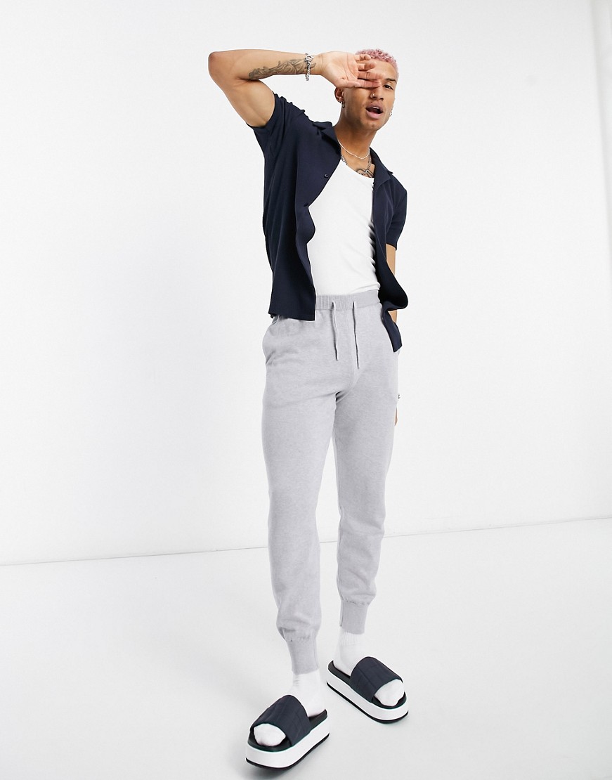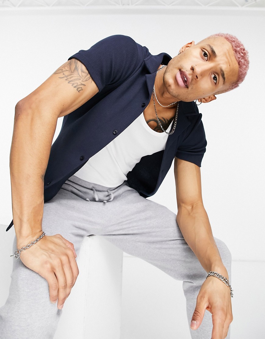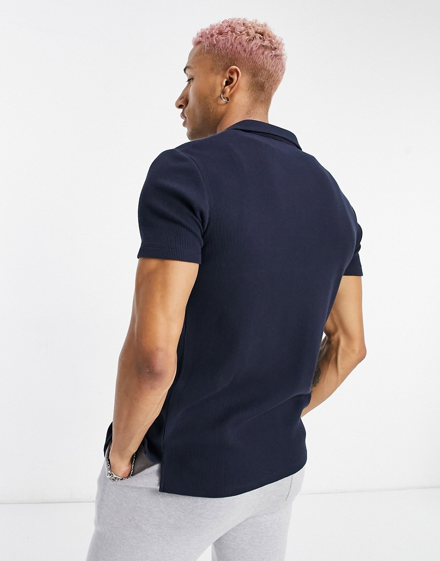Granatowa luźna koszula o waflowej strukturze z kołnierzykiem kubańskim M