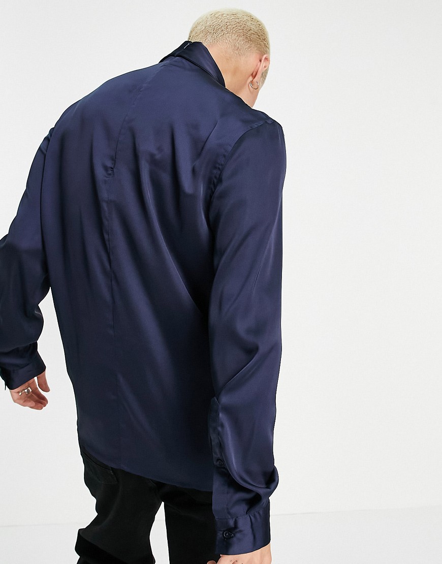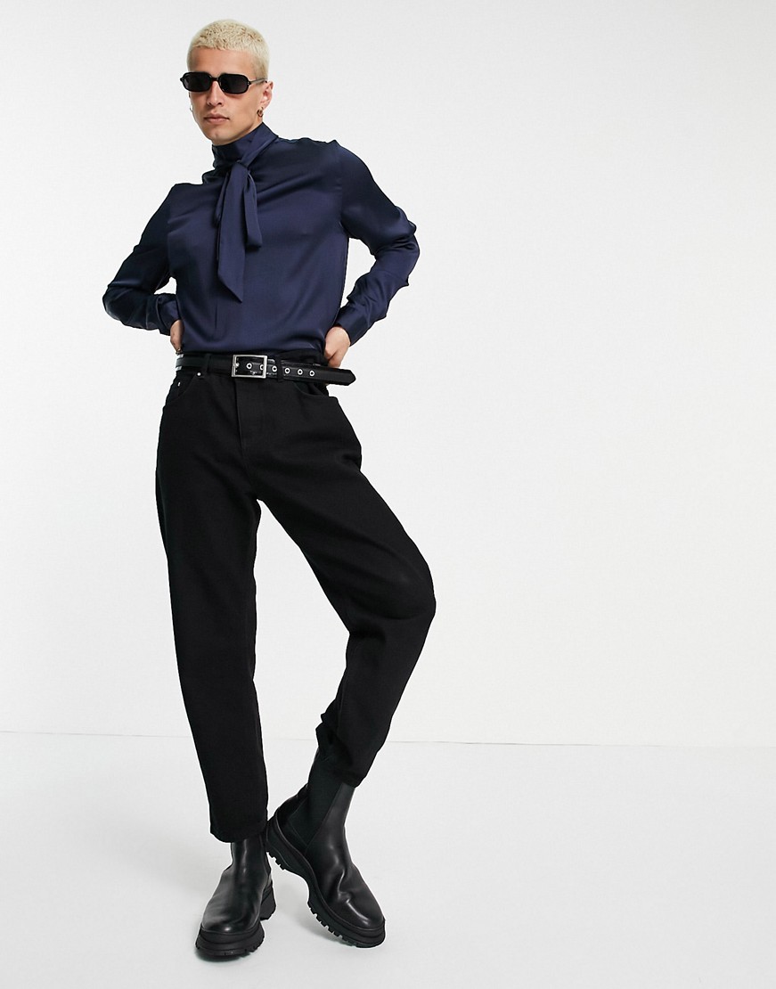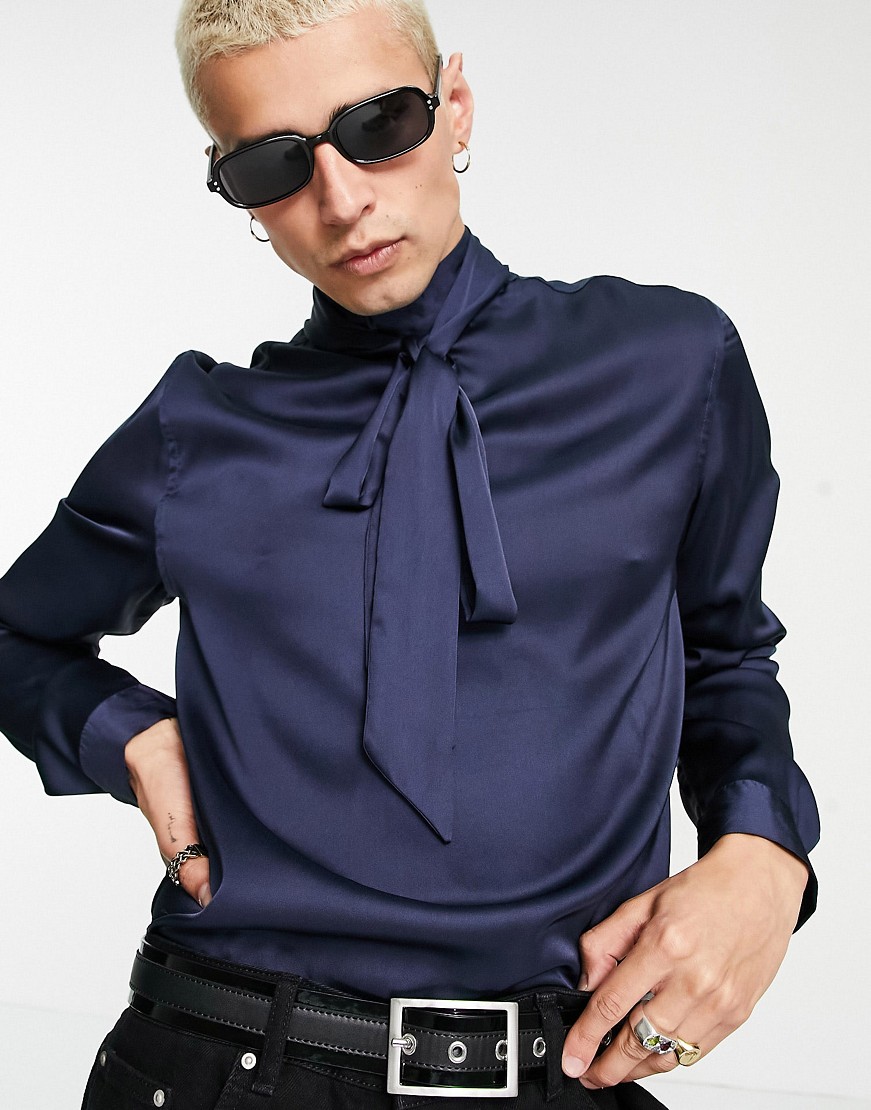 Granatowa satynowa koszula męska o regularnym kroju z wiązaniem pod szyją M