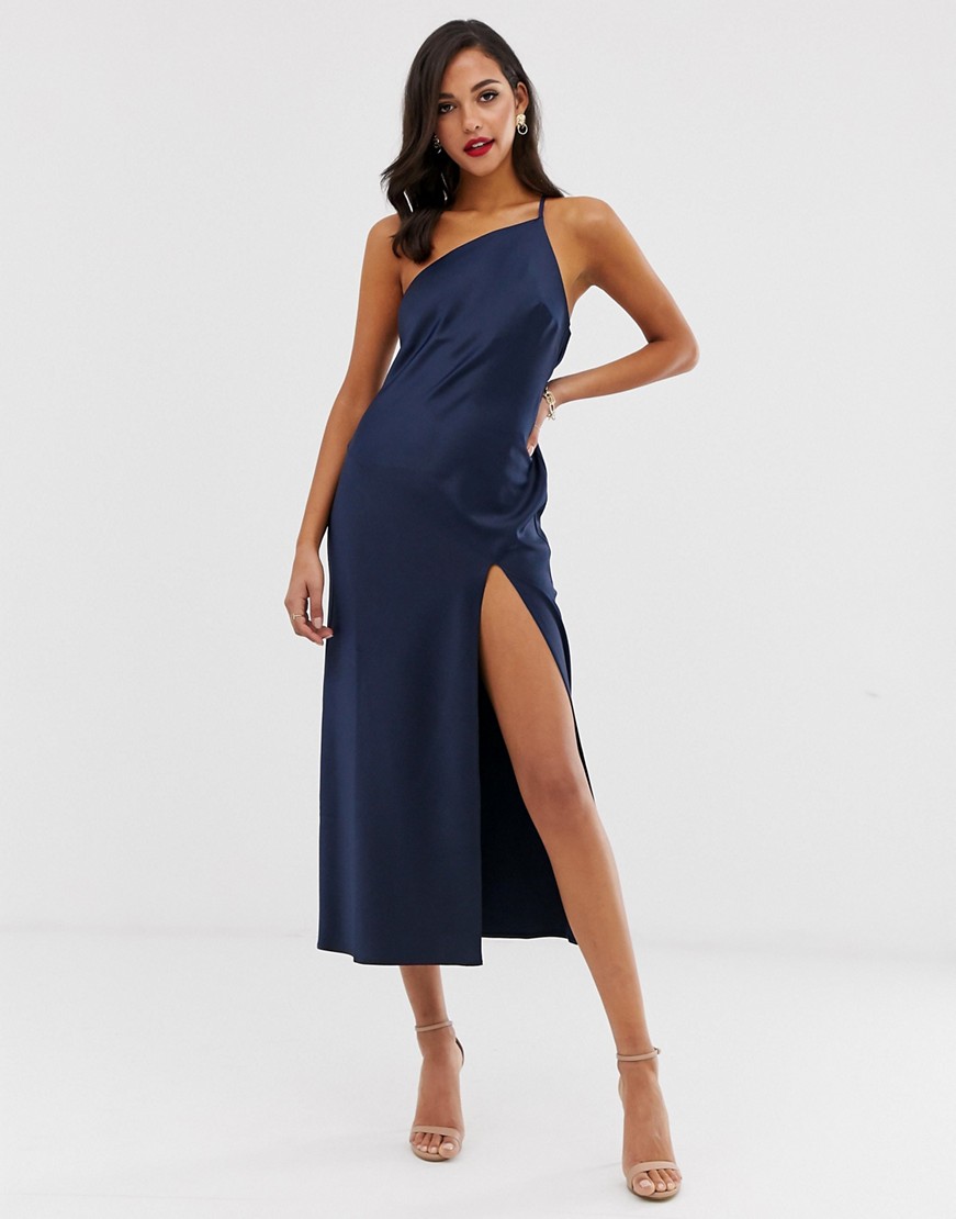 Granatowa satynowa sukienka midi na jedno ramię z rozcięciem 40