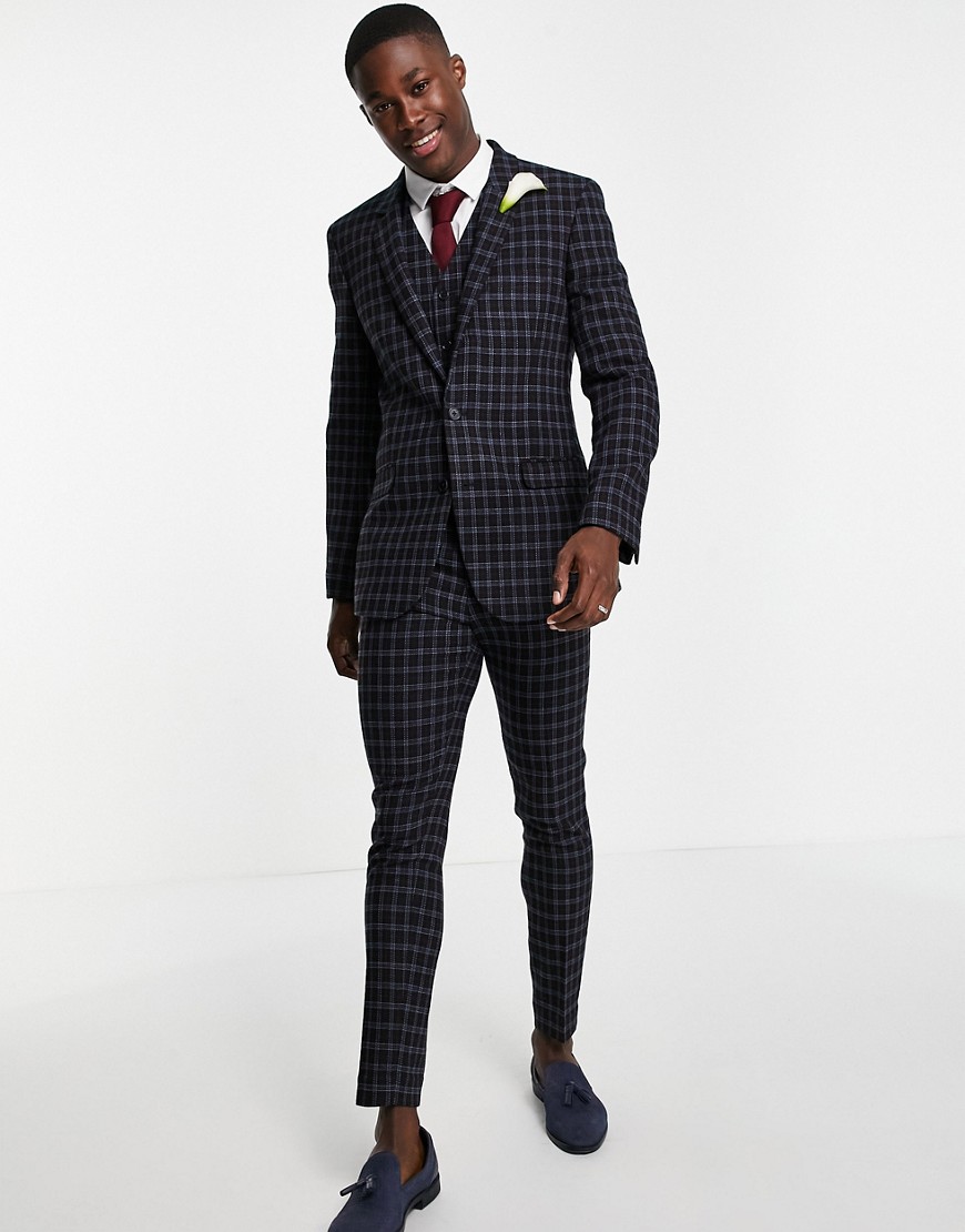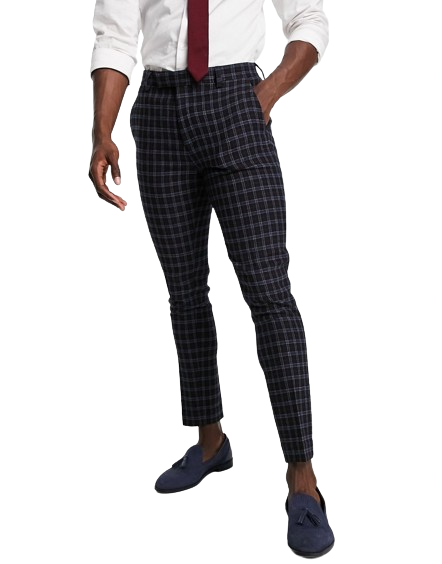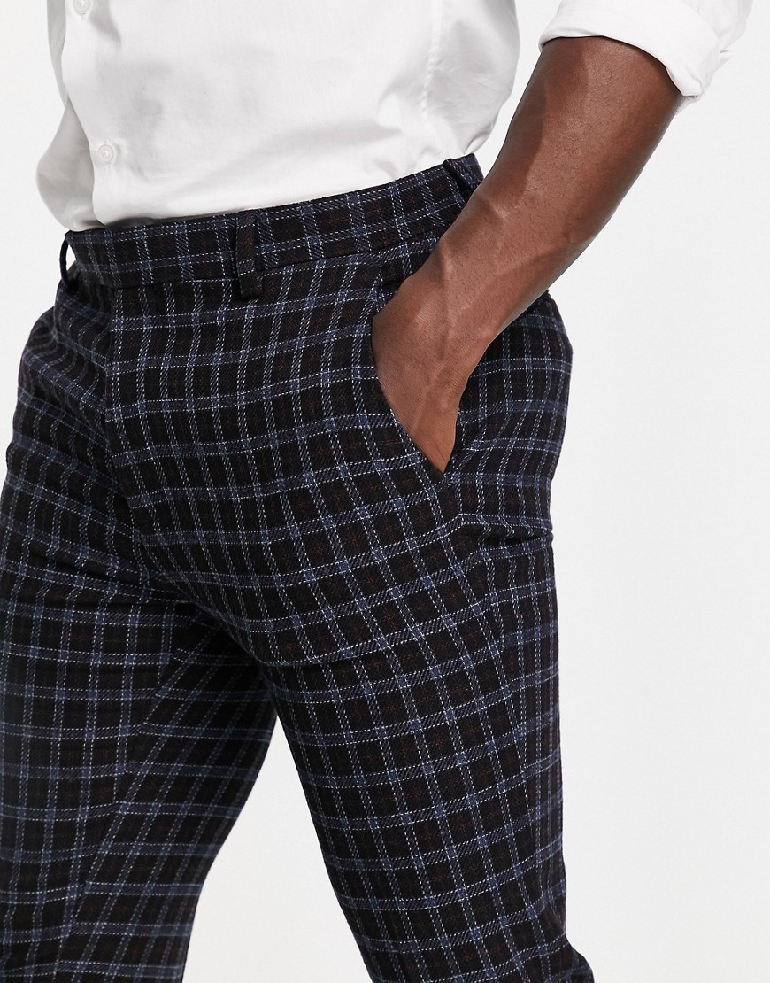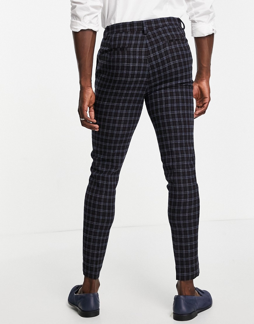 Granatowe męskie spodnie garniturowe skinny z domieszką wełny w kratę defekt W28 L30