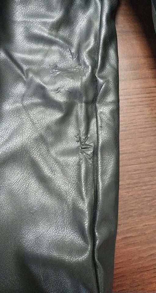 • defekt uszkodzenie materiału z tyłu lewej nogawki