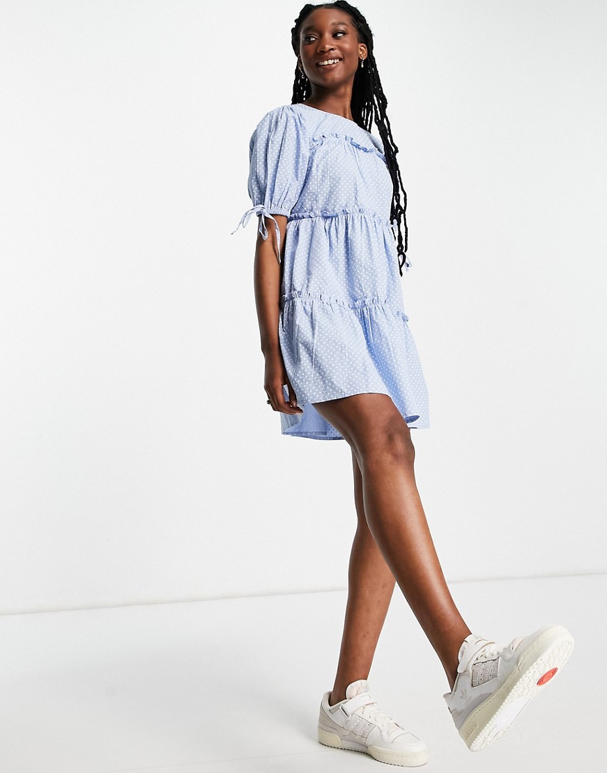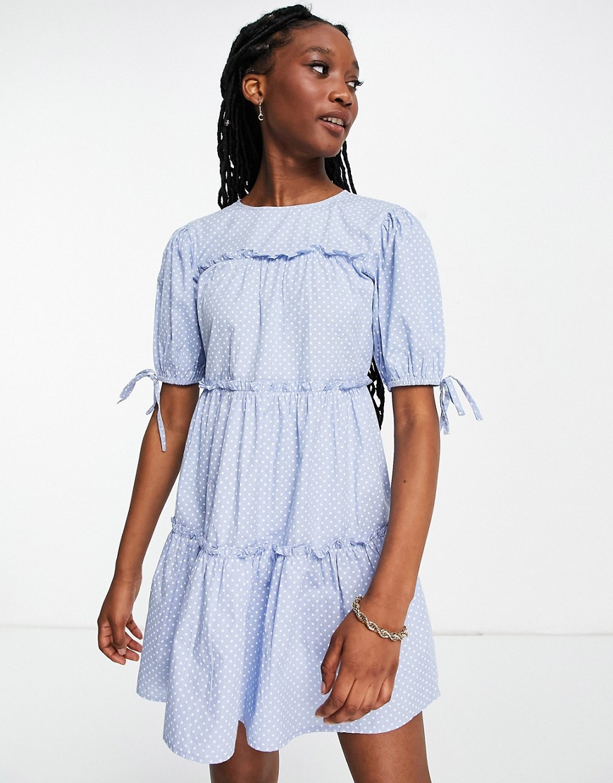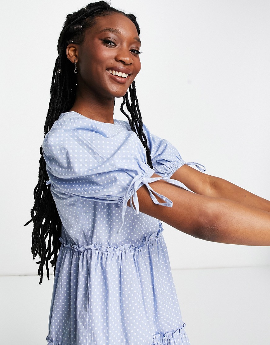 Influence warstwowa sukienka mini w kropki wiązane rękawy niebieska 44