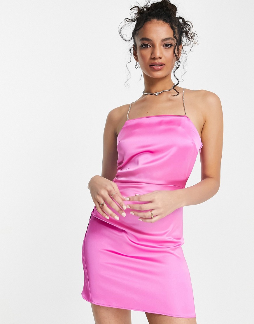 Jaskraworóżowa satynowa sukienka mini defekt 36