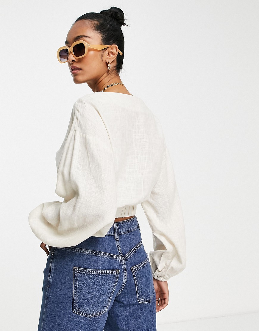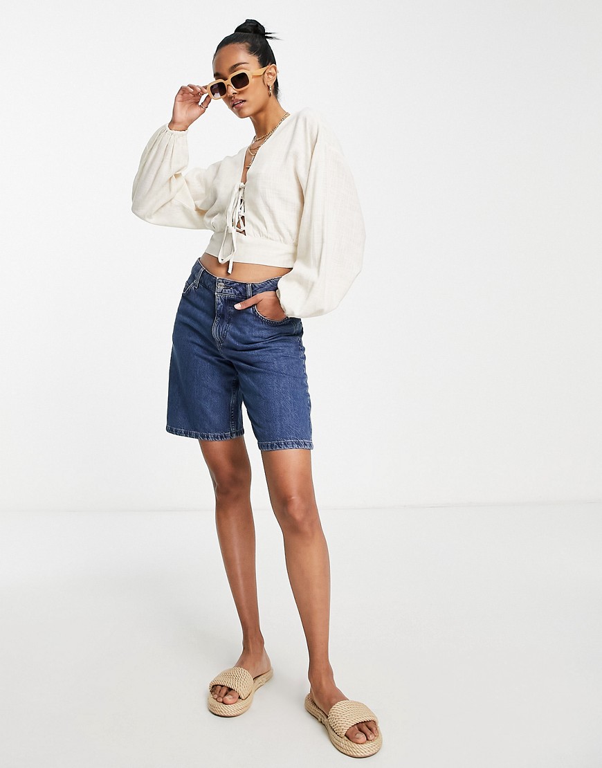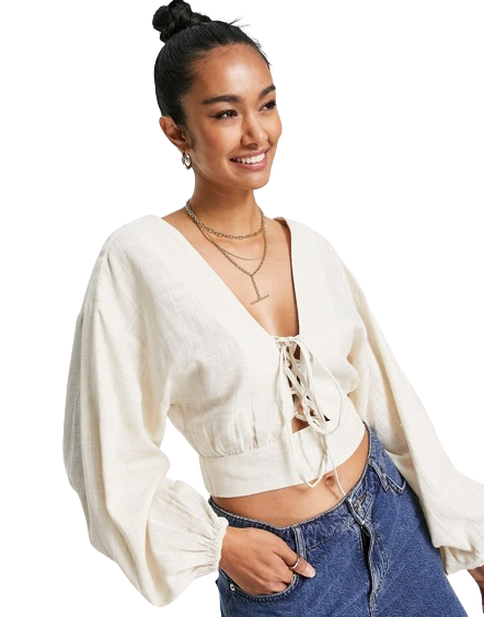Jasnobeżowy lniany top ze sznurowaniem z przodu i obszernymi rękawami defekt 34
