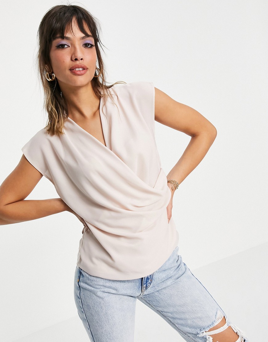 Jasnoróżowa bluzka bez rękawów z drapowanym i kopertowym przodem 38