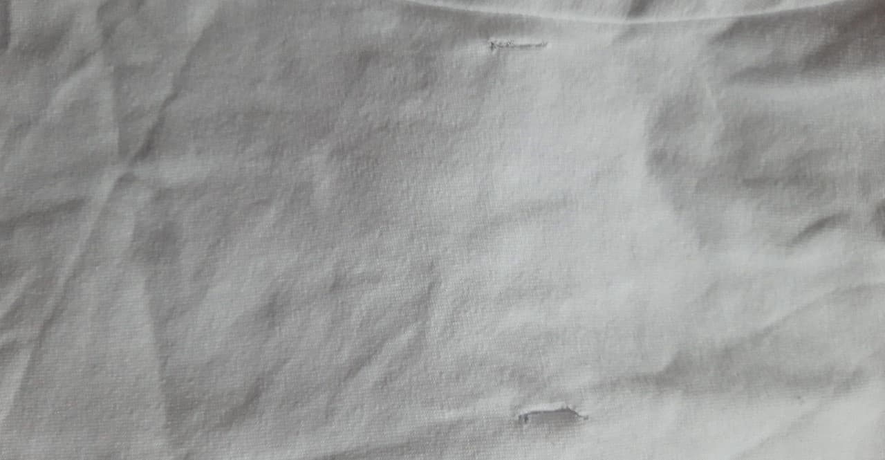 • Defekt: pocięty – ok. 1 cm długości w pionie- w 4 miejscach – z przodu i z tyłu (zdjęcia)