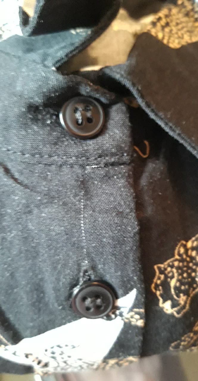 - DEFEKT: niedobarwiona nitka u góry pod kołnierzem – mało widoczna (zdjęcie)
