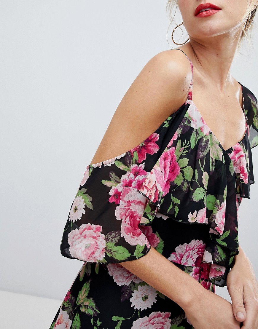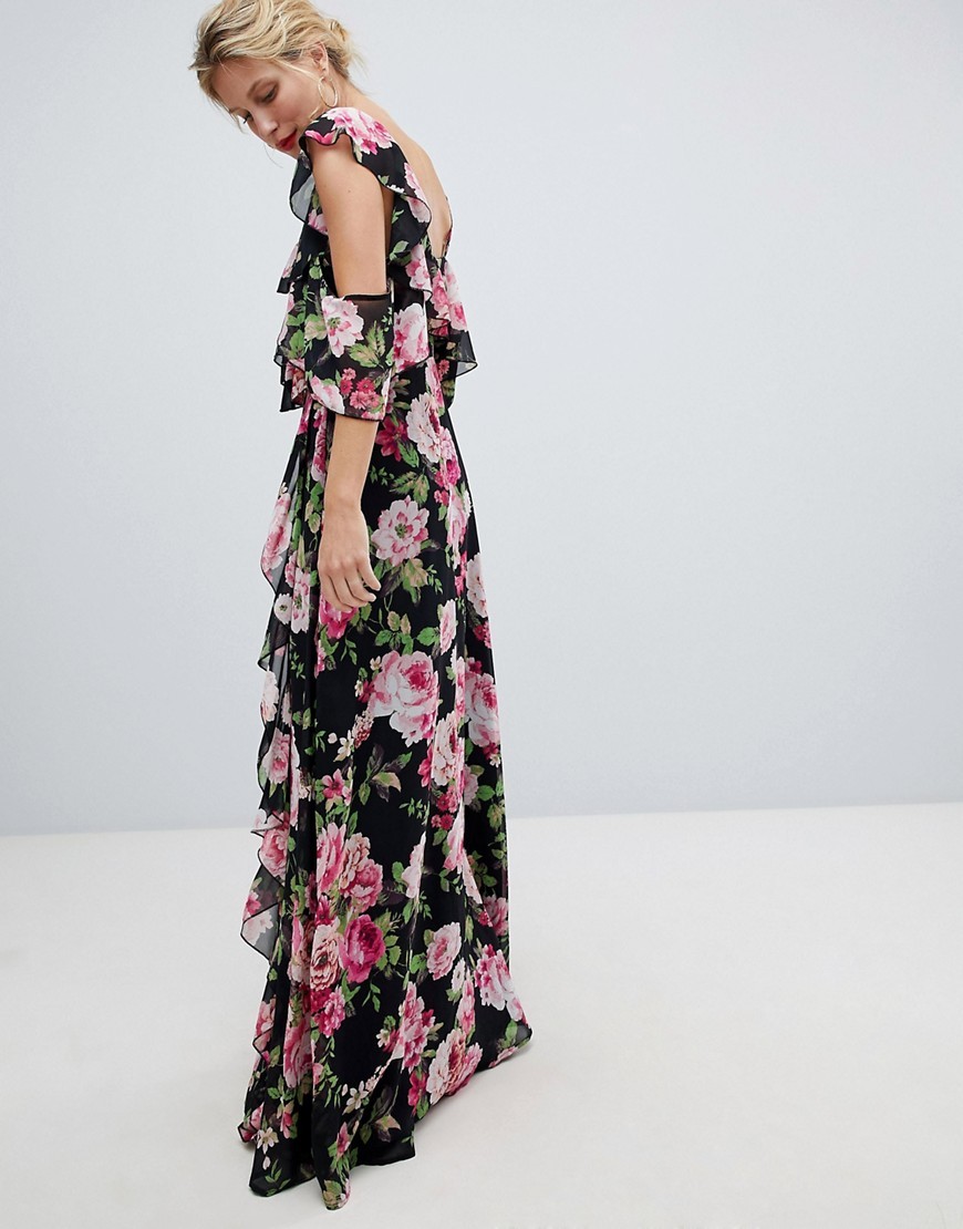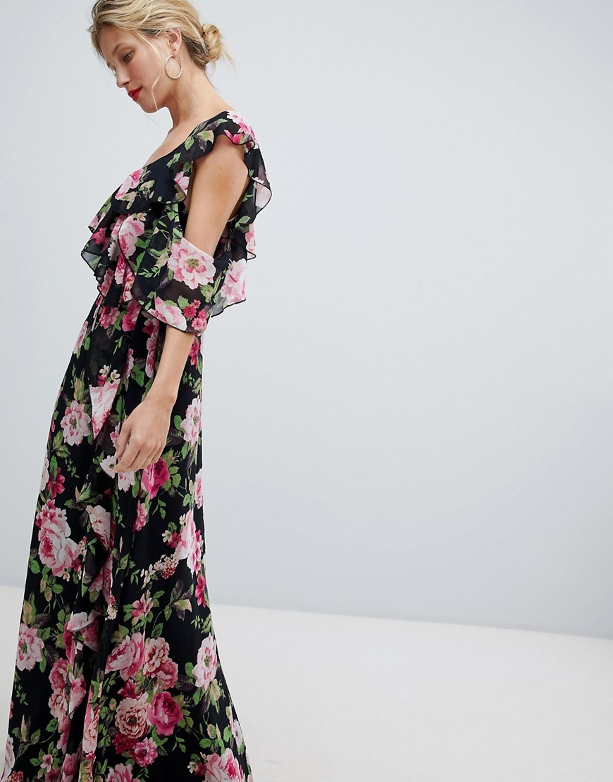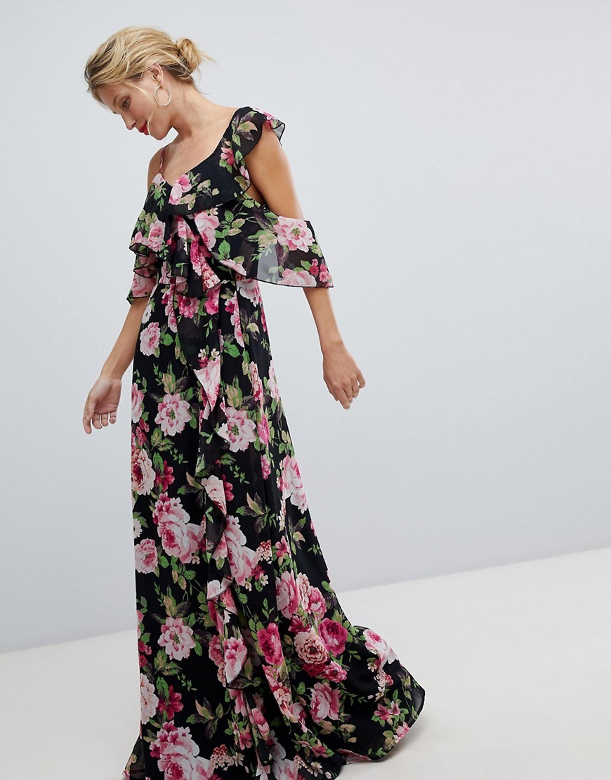 Czarna Sukienka maxi w kwiaty z falbanami XS 34