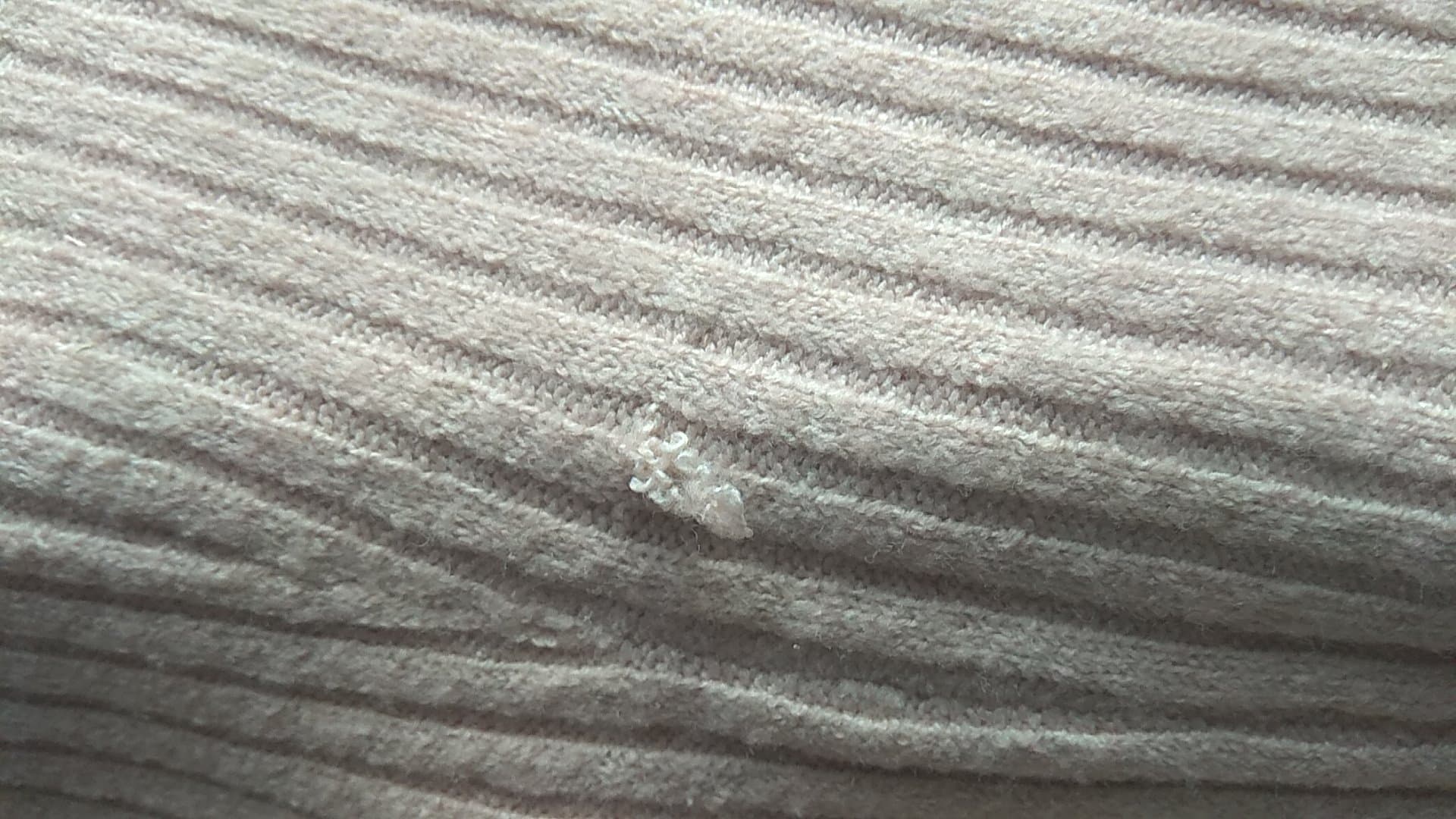 • Defekt: Wyciągnięta nitka z tyłu, skulkowane (zdjęcie)