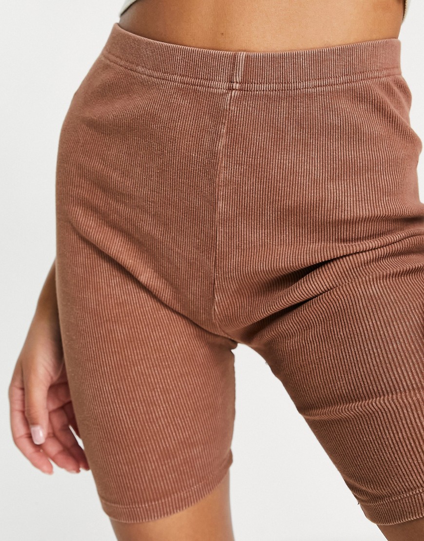 Kawowe krótkie prążkowane legginsy z efektem sprania 40