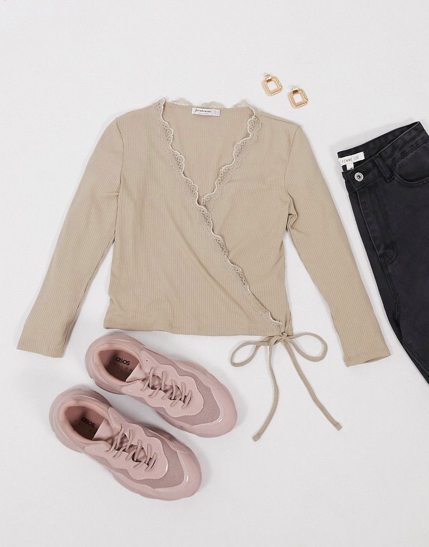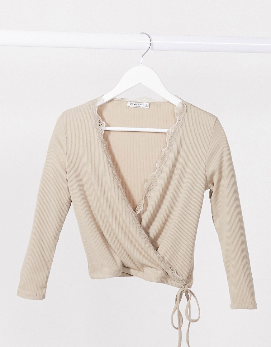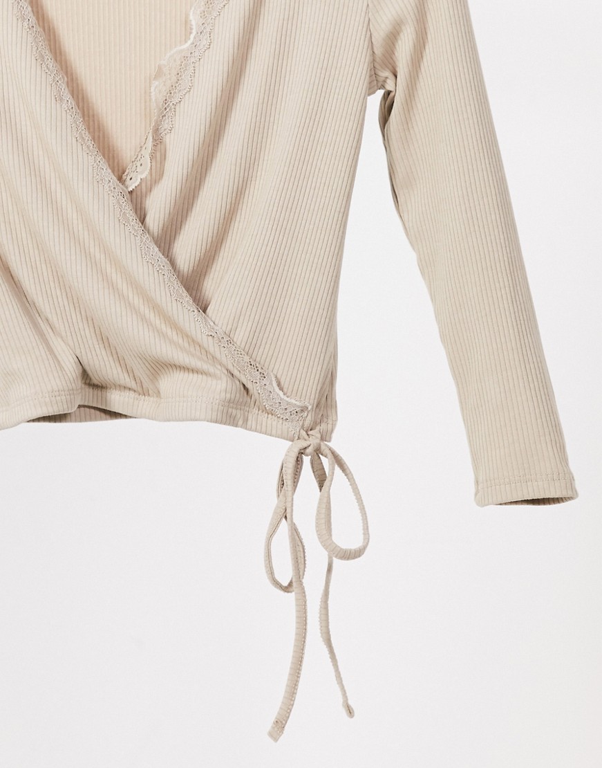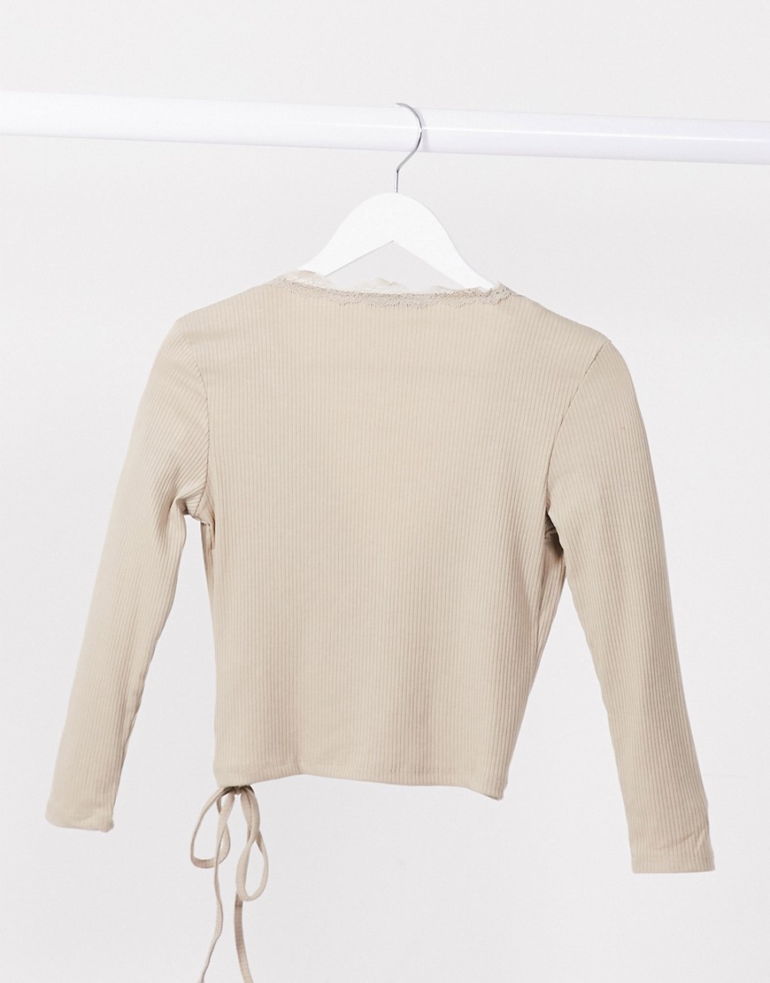 Kopertowy top z długim rękawem z koronkowym detalem w kolorze beżowym S
