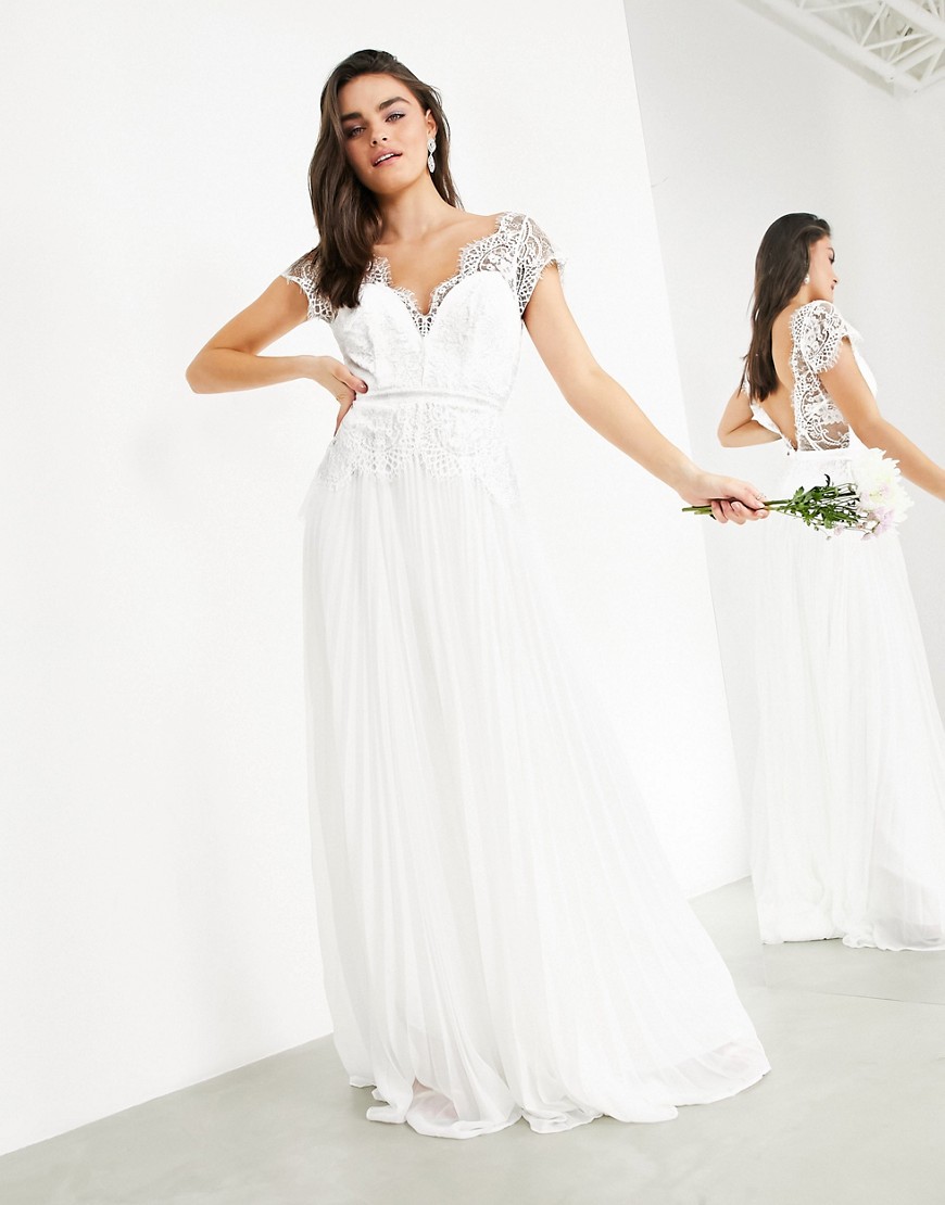 Koronkowa sukienka ślubna z głębokim dekoltem i plisowaną spódnicą 40