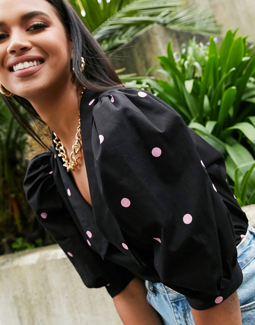 Koszula z bufkami, dekoltem w kształcie litery V z kołnierzykiem i wzorem w kropki 36