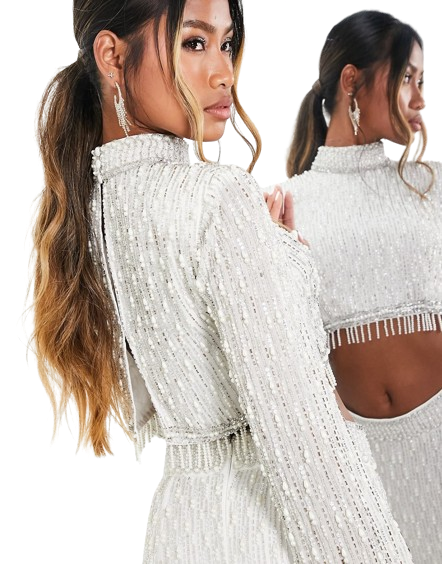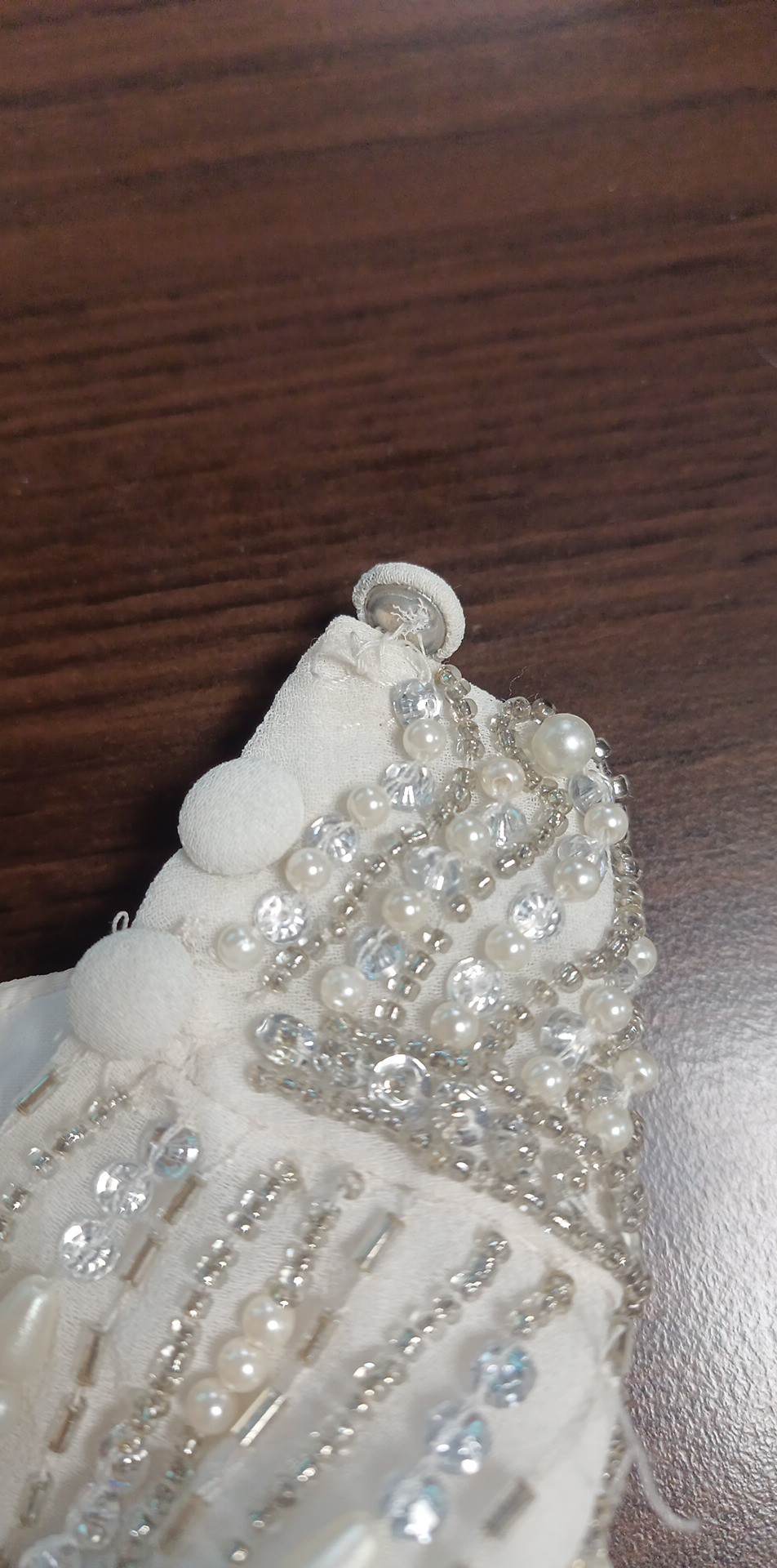 - Całość wyszywana koralikami i sztucznymi perłami