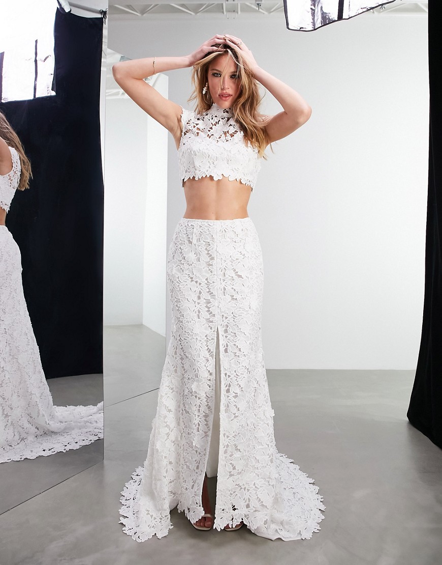Krótki koronkowy top w kwiaty ivory wysoki dekolt 34