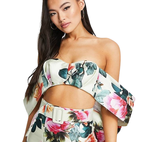 Krótki top bardot z kokardką w kwiecisty nadruk defekt 40