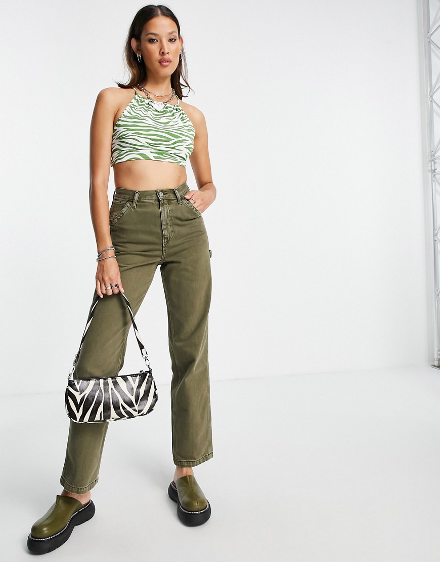 Krótki top na ramiączkach z wiązaniem na plecach w zeberkę khaki S